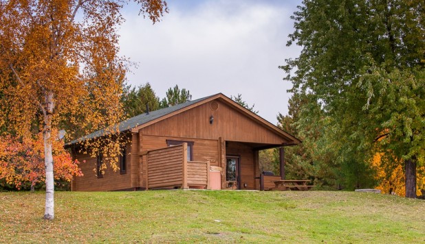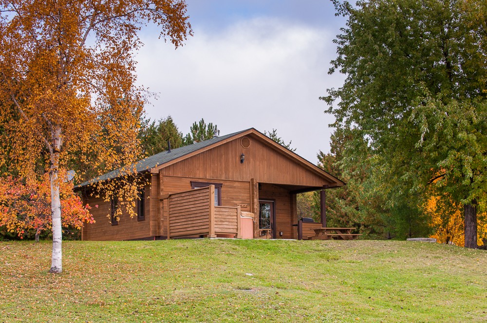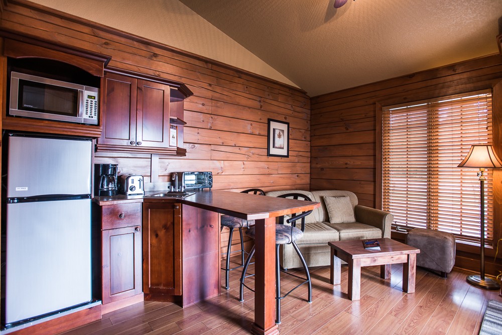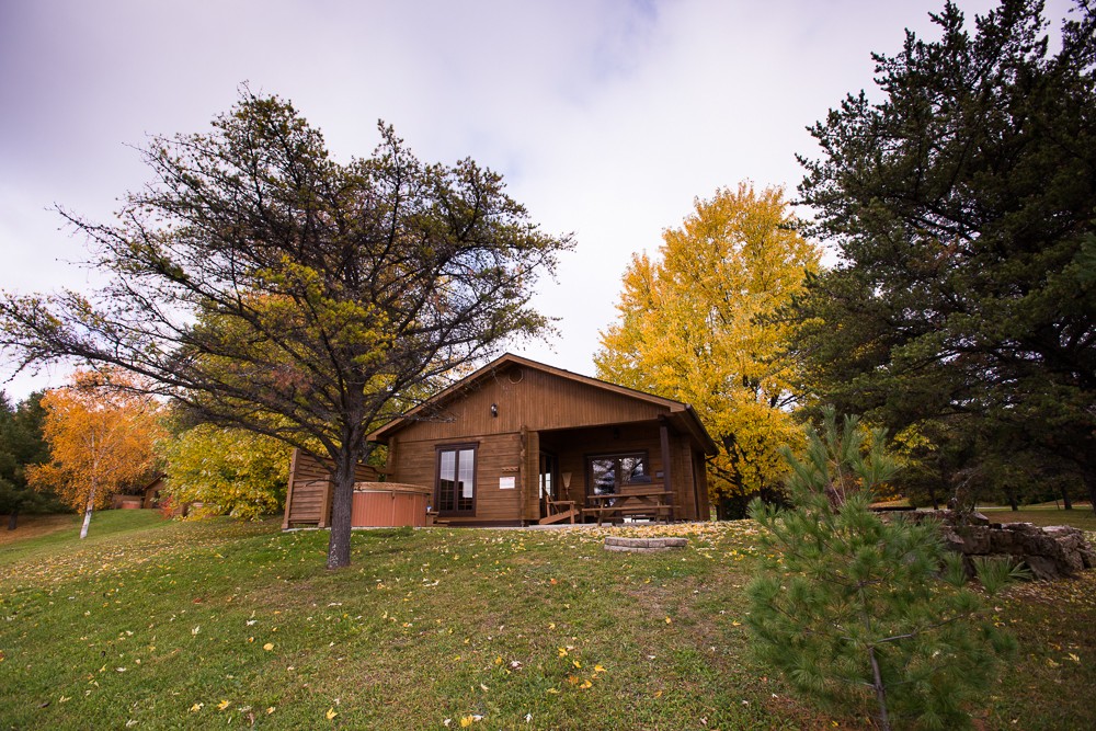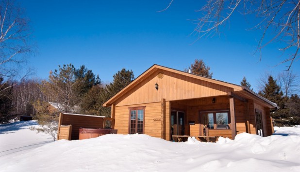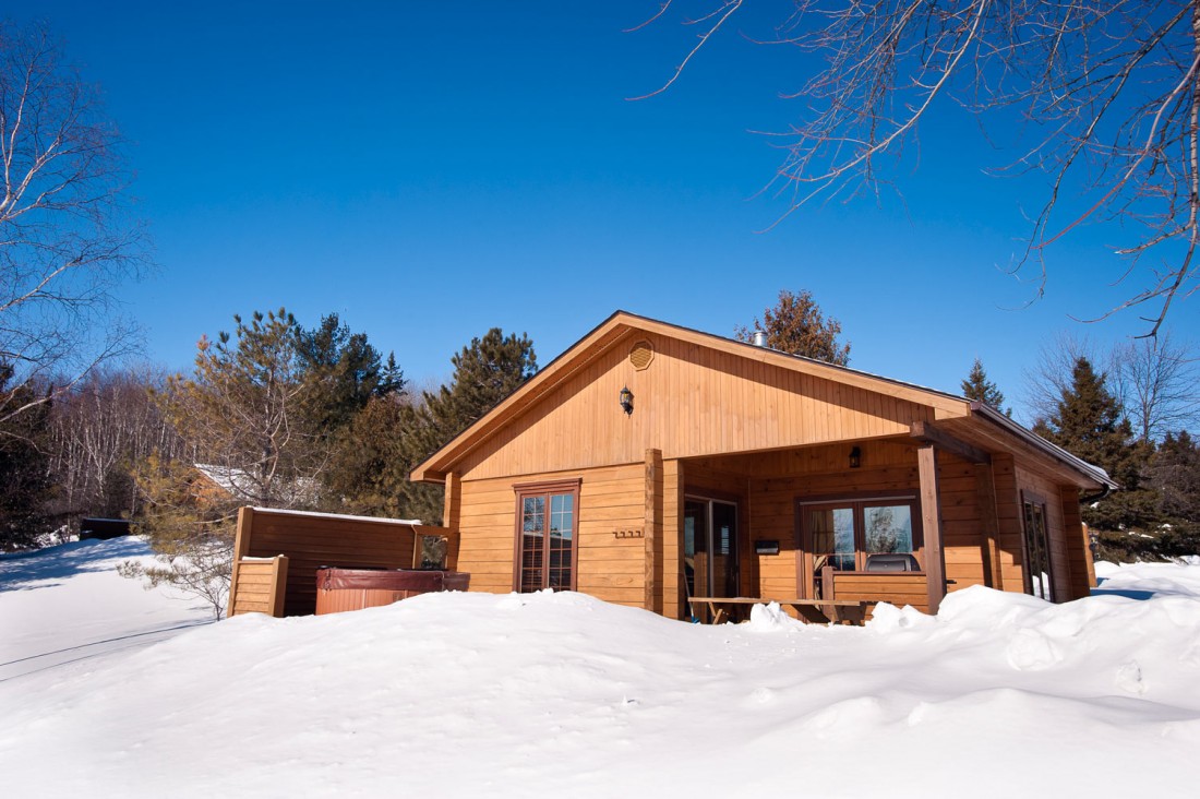 Ce chalet peut accueillir un maximum de deux adultes et un enfant. La chambre est fermée. On y retrouve un lit Queen, un bain détente pour deux personnes, un coin coiffure, une douche et un cabinet de toilette. Au salon se trouve un foyer au propane, un divan-lit de 39 pouces, un module d'air climatisé, une télévision écran plat avec satellite et un lecteur DVD. L’aire de cuisine est composée d’un comptoir lunch, un réfrigérateur, un four micro-onde, une plaque de cuisson électrique à deux foyers, une cafetière, un four grille-pain, un grille-pain régulier et un service de vaisselle complet pour trois. À l’extérieur, on retrouve un barbecue, une table à pique-nique, un emplacement pour feu de camp ainsi qu’un spa privé. Du chalet, vous avez accès au wi-fi.