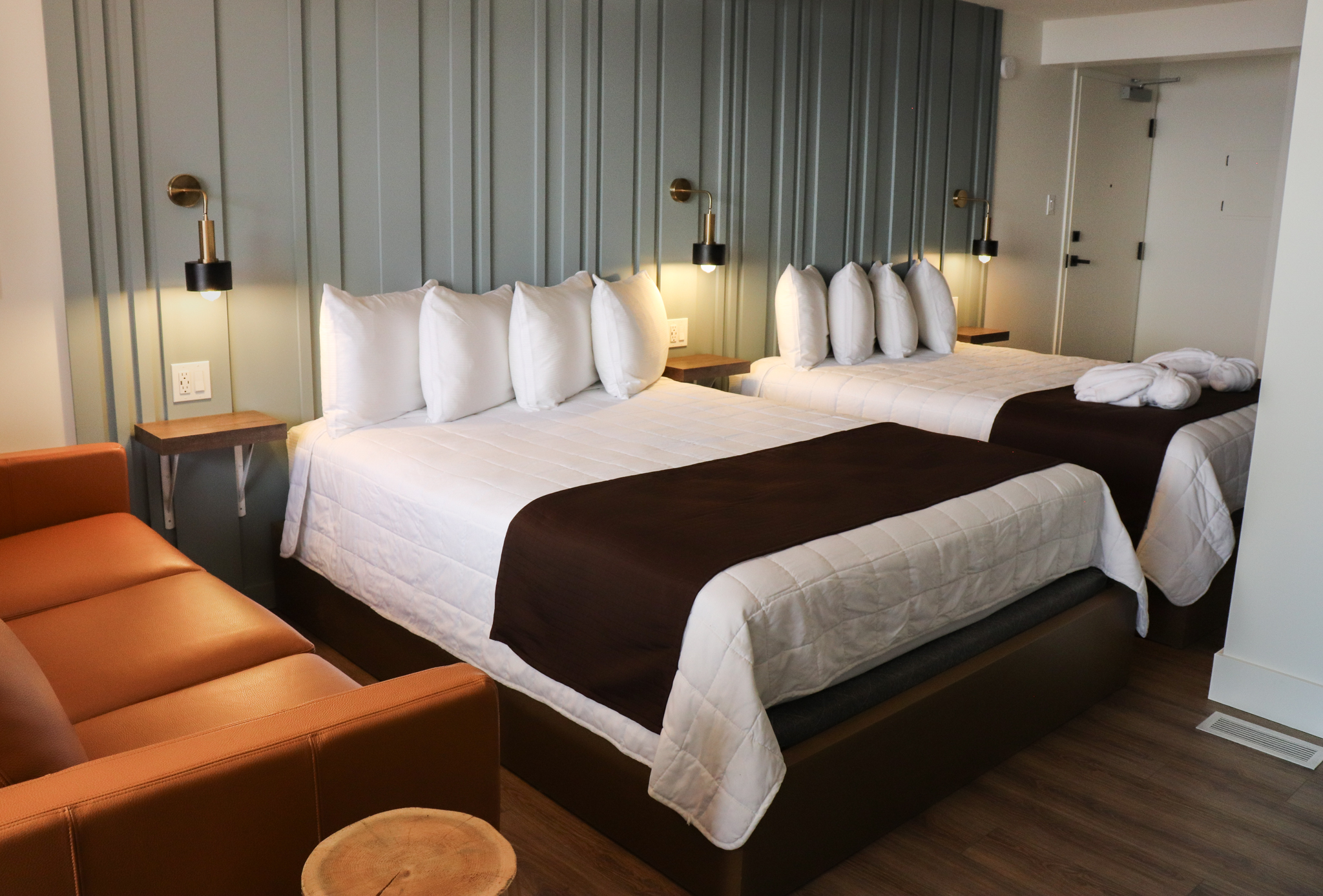 Cete chambre peut accueillir un maximum de 4 adultes. C'est une chambre à aire ouverte; style « bachelor ». Dans la grande pièce, on retrouve deux lits Queens et un coin salon , un module d'air climatisé et une télévision écran plat avec satellite. L’aire de cuisine est composée d’un comptoir lunch, un petit réfrigérateur, un four micro-onde, une plaque de cuisson électrique à deux foyers, une cafetière, un four grille-pain, un grille-pain régulier et un service de vaisselle pour quatre. La salle de bain adjacente comprend un bain/douche. À l’extérieur, on retrouve un barbecue, une table à pique-nique et un feu au propane. De la chambre, vous avez accès au wi-fi.