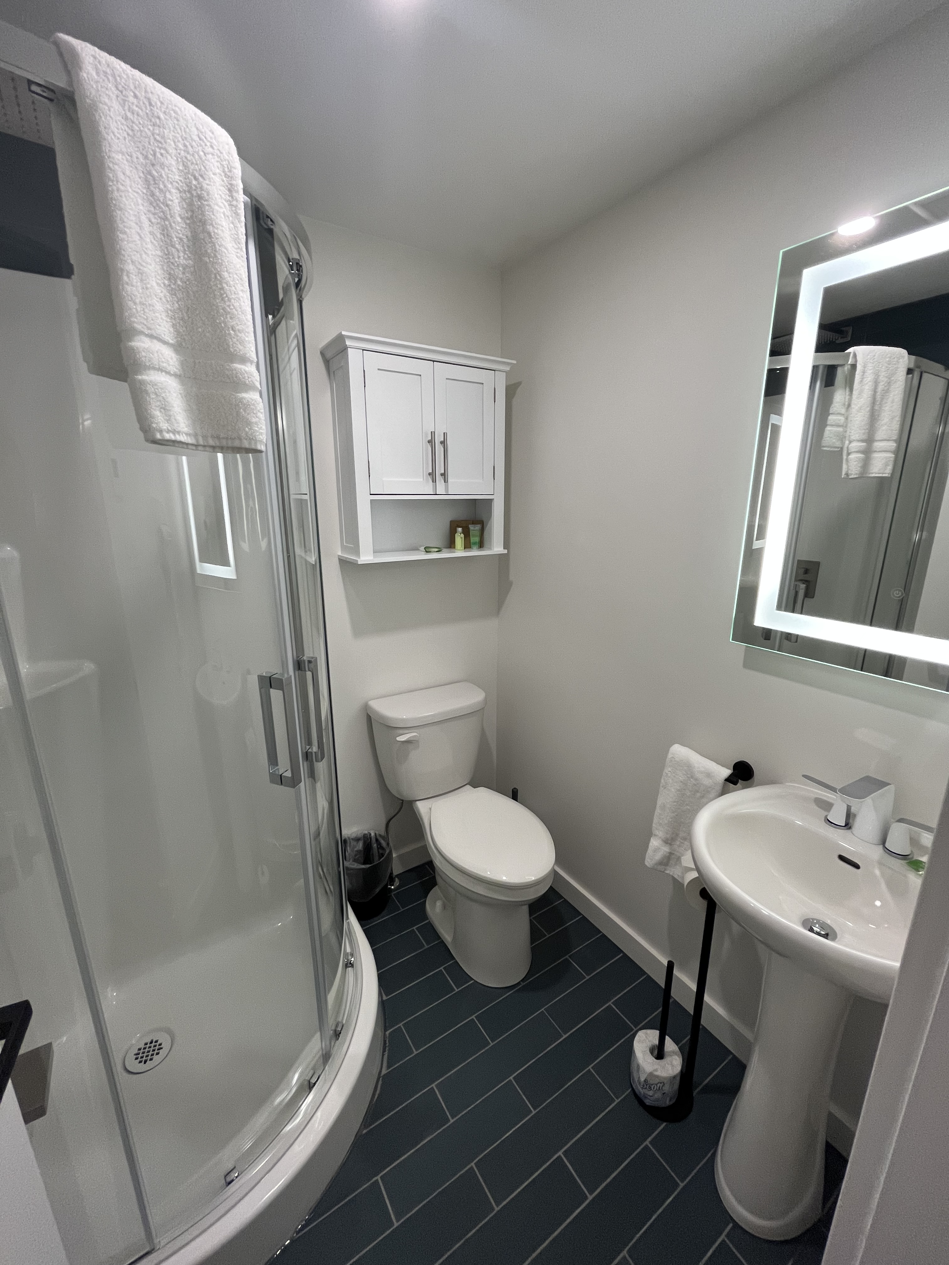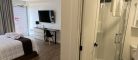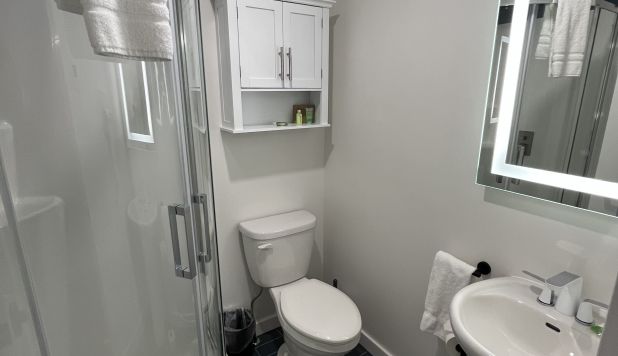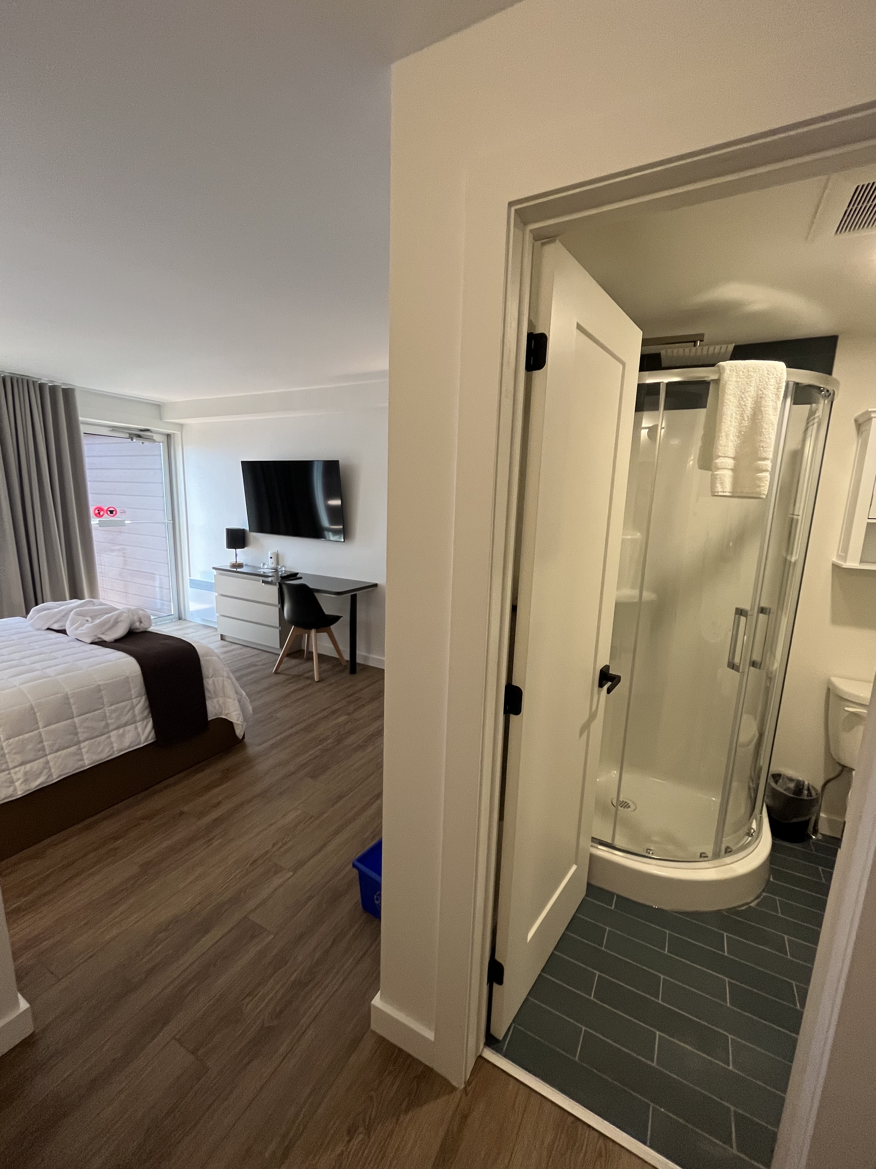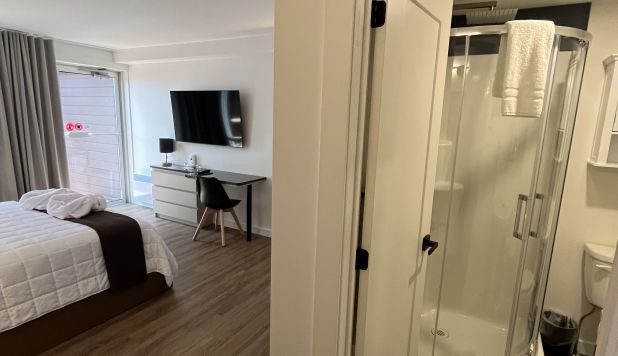 Cette chambre peut accueillir un maximum de 2 adultes. C'est une chambre à aire ouverte; style « bachelor ». Dans la grande pièce, on retrouve un lit Queen et un coin salon , un module d'air climatisé et une télévision écran plat avec satellite. L’aire de cuisine est composée d’un comptoir lunch, un petit réfrigérateur, un four micro-onde, une plaque de cuisson électrique à deux foyers, une cafetière, un four grille-pain, un grille-pain régulier et un service de vaisselle pour deux. La salle de bain adjacente comprend une douche. À l’extérieur, on retrouve un barbecue, une table à pique-nique et un feu au propane. De la chambre, vous avez accès au wi-fi.