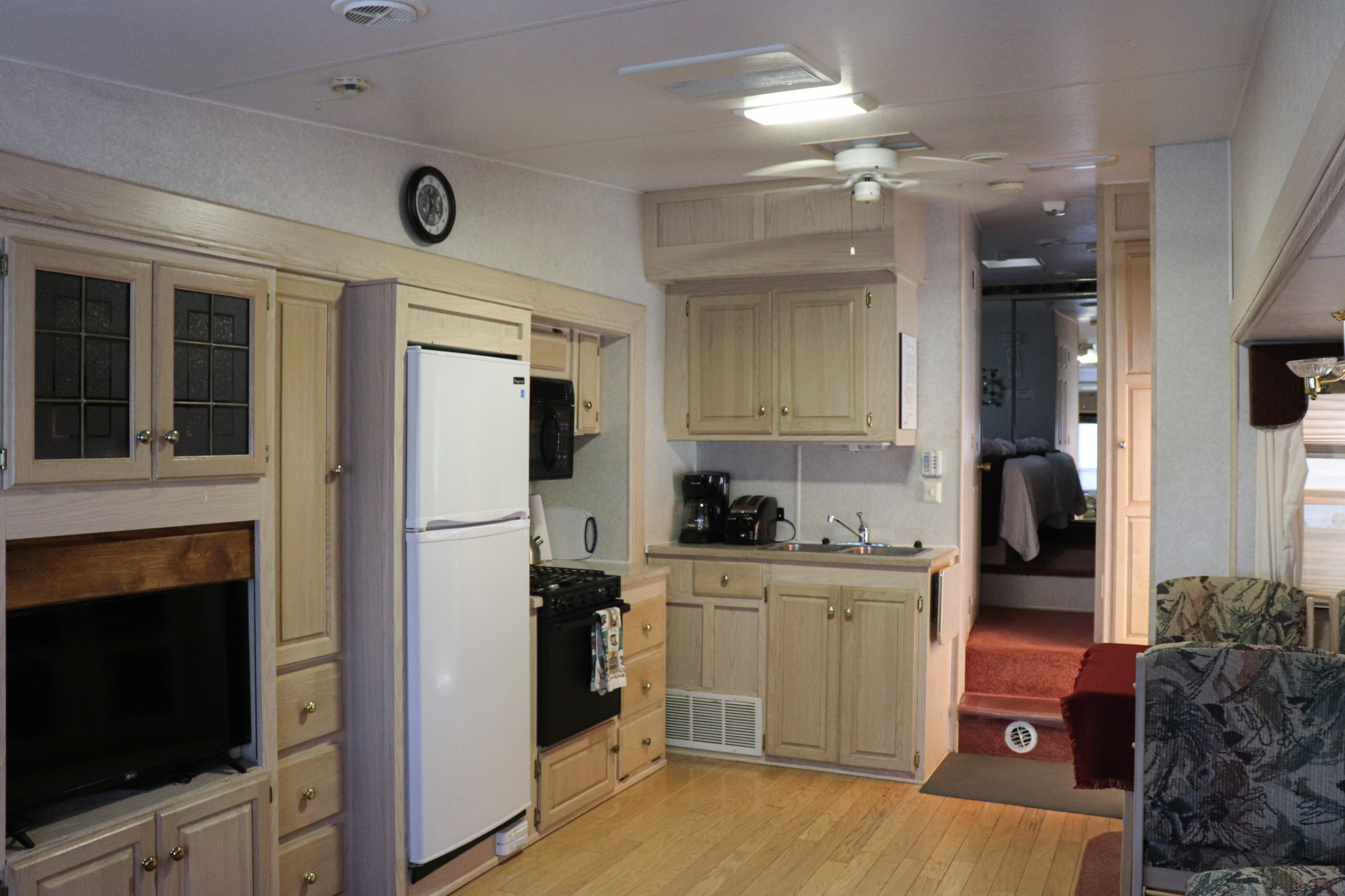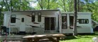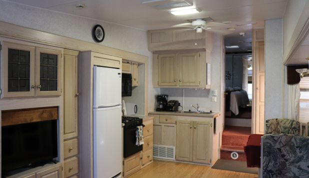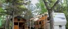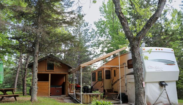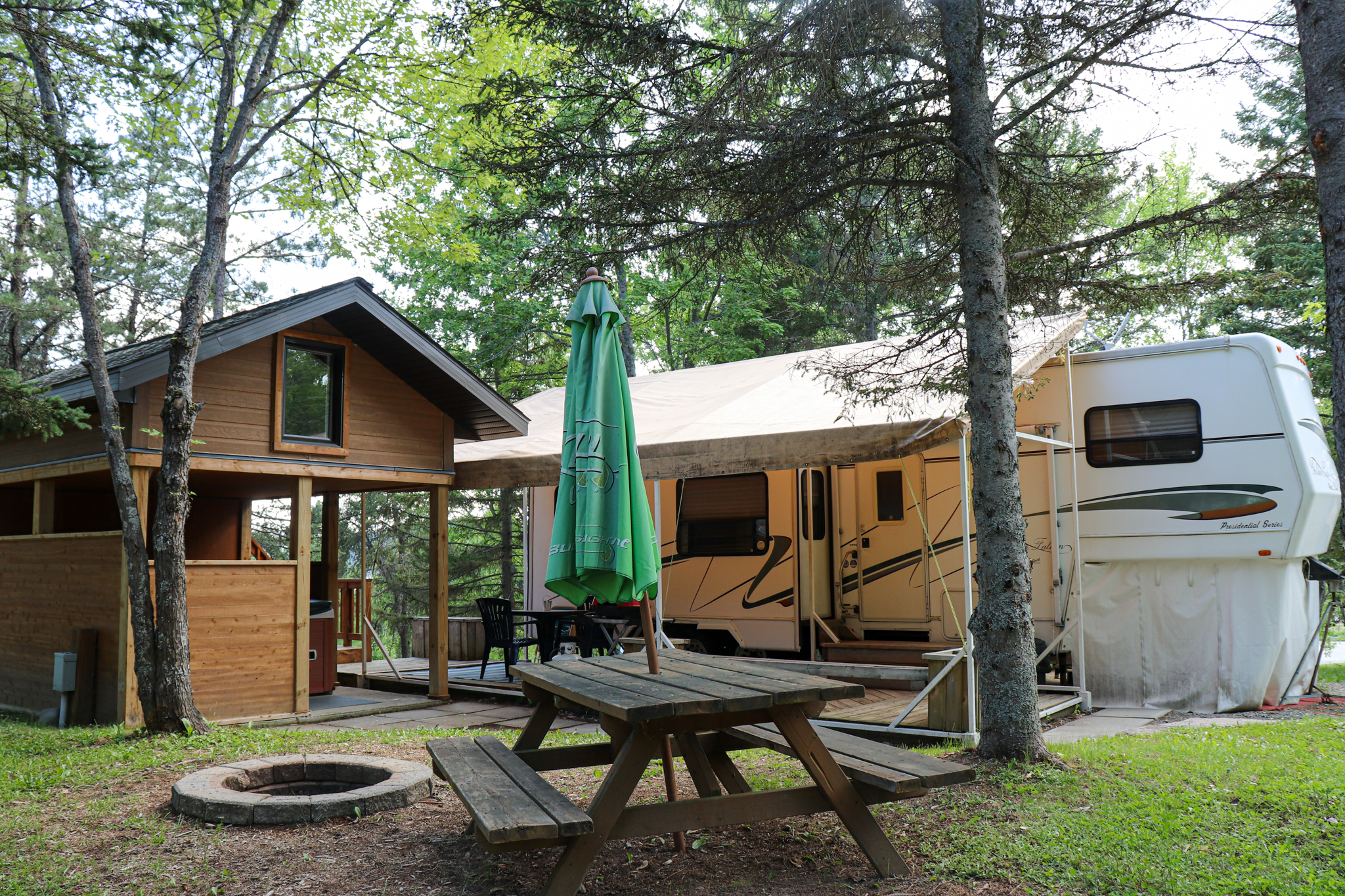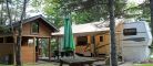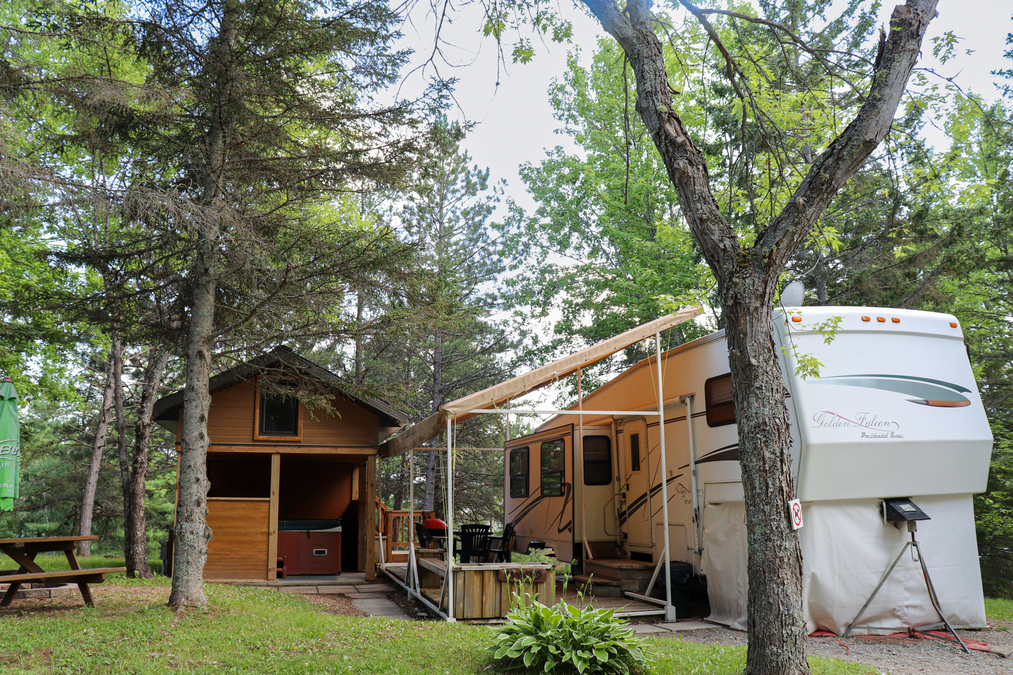This air-conditioned trailer can accomodate a maximum of 4 people. It consist of a bedroom with queen bed. The kitchen is equipped with a refrigerator, stove, microwave oven, coffee maker, toaster and a complete dishes ans cutlery set. In the lounge there is a TV, DVD player and a 54 inches pull-out couch. The trailer includes a full bathroom. Outside, you will find a barbecue, a fire pit and a private hot tub. This trailer of 32’ is located on the campground number 9.