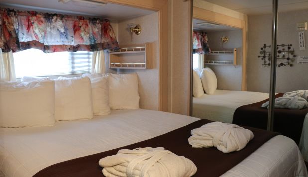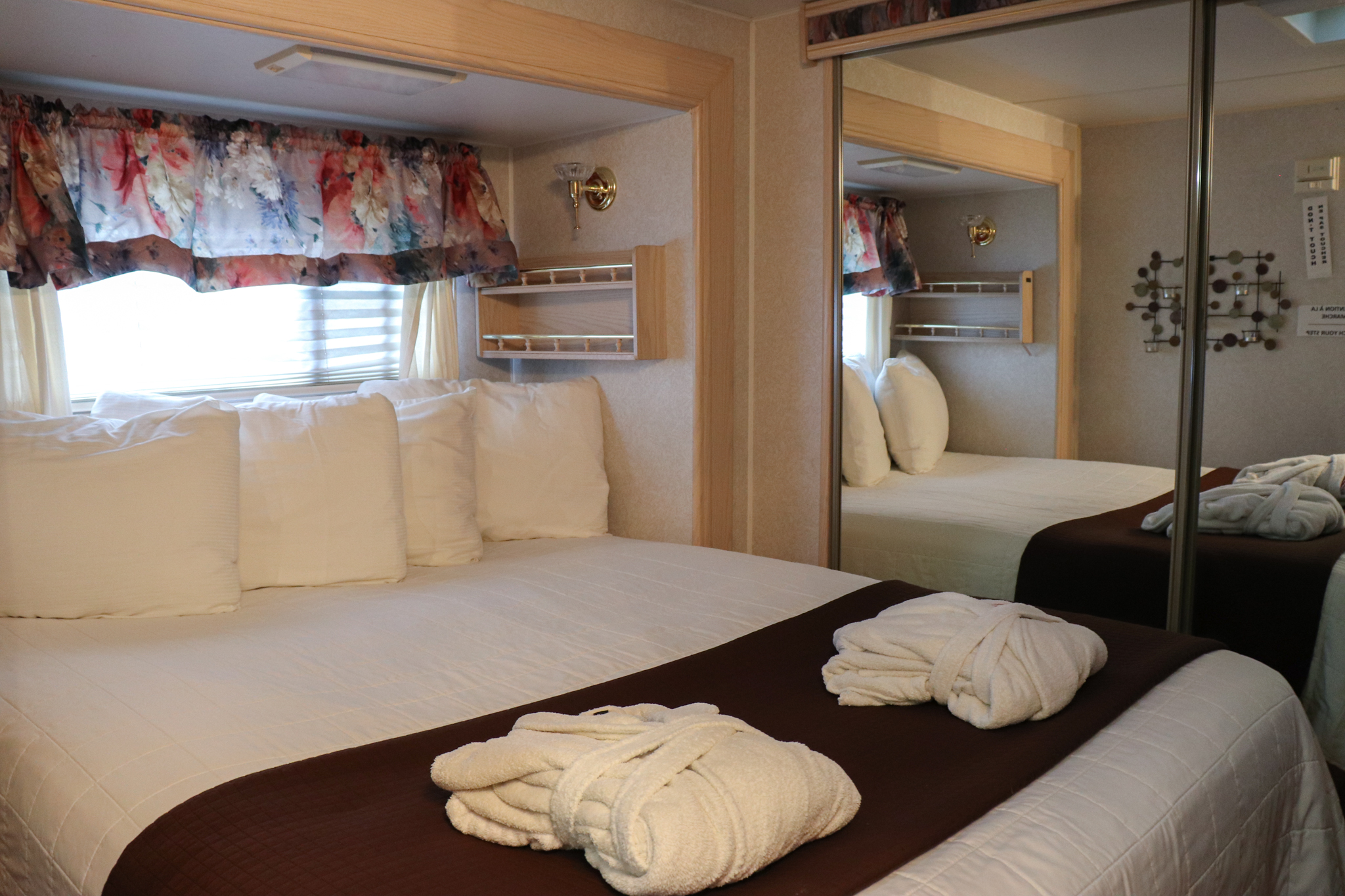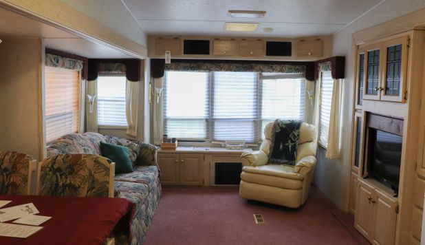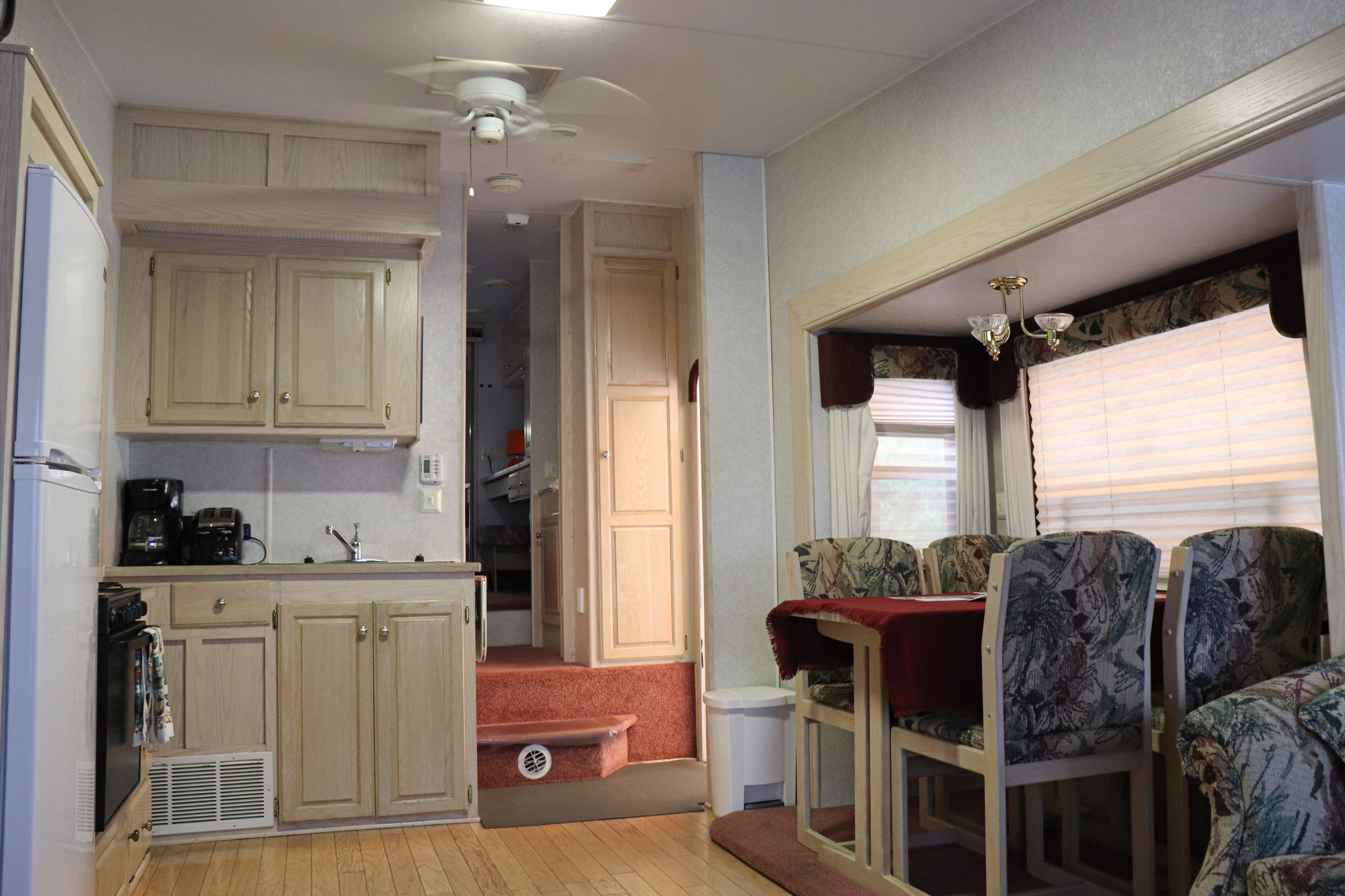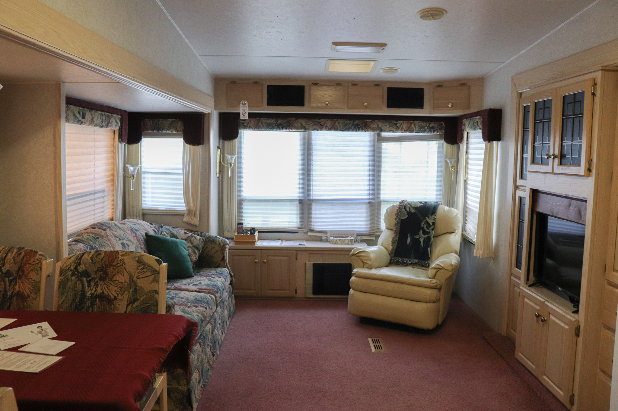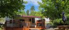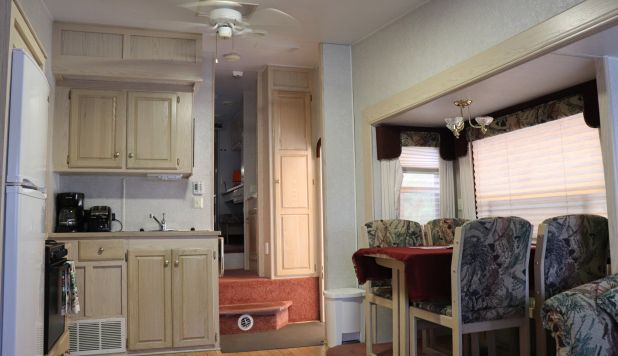 This air-conditioned trailer can accomodate a maximum of 4 people. It consist of a bedroom with queen bed. The kitchen is equipped with a refrigerator, stove, microwave oven, coffee maker, toaster and a complete dishes ans cutlery set. In the lounge there is a TV, DVD player and a 54 inches pull-out couch. The trailer includes a full bathroom. Outside, you will find a barbecue, a fire pit and a private hot tub. This trailer of 32’ is located on the campground number 9.