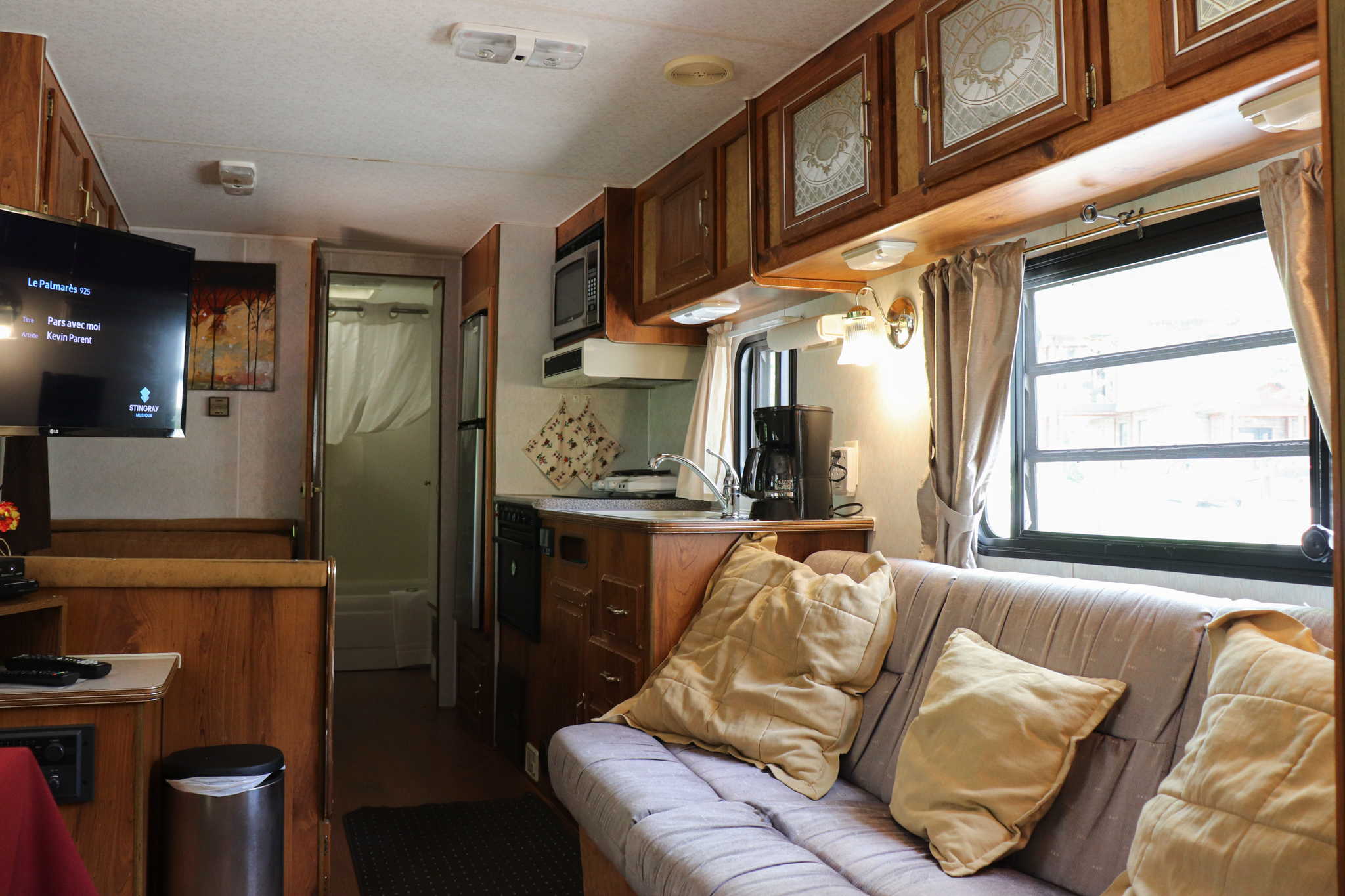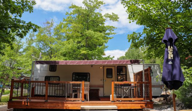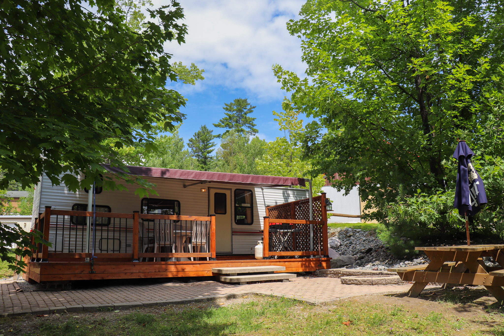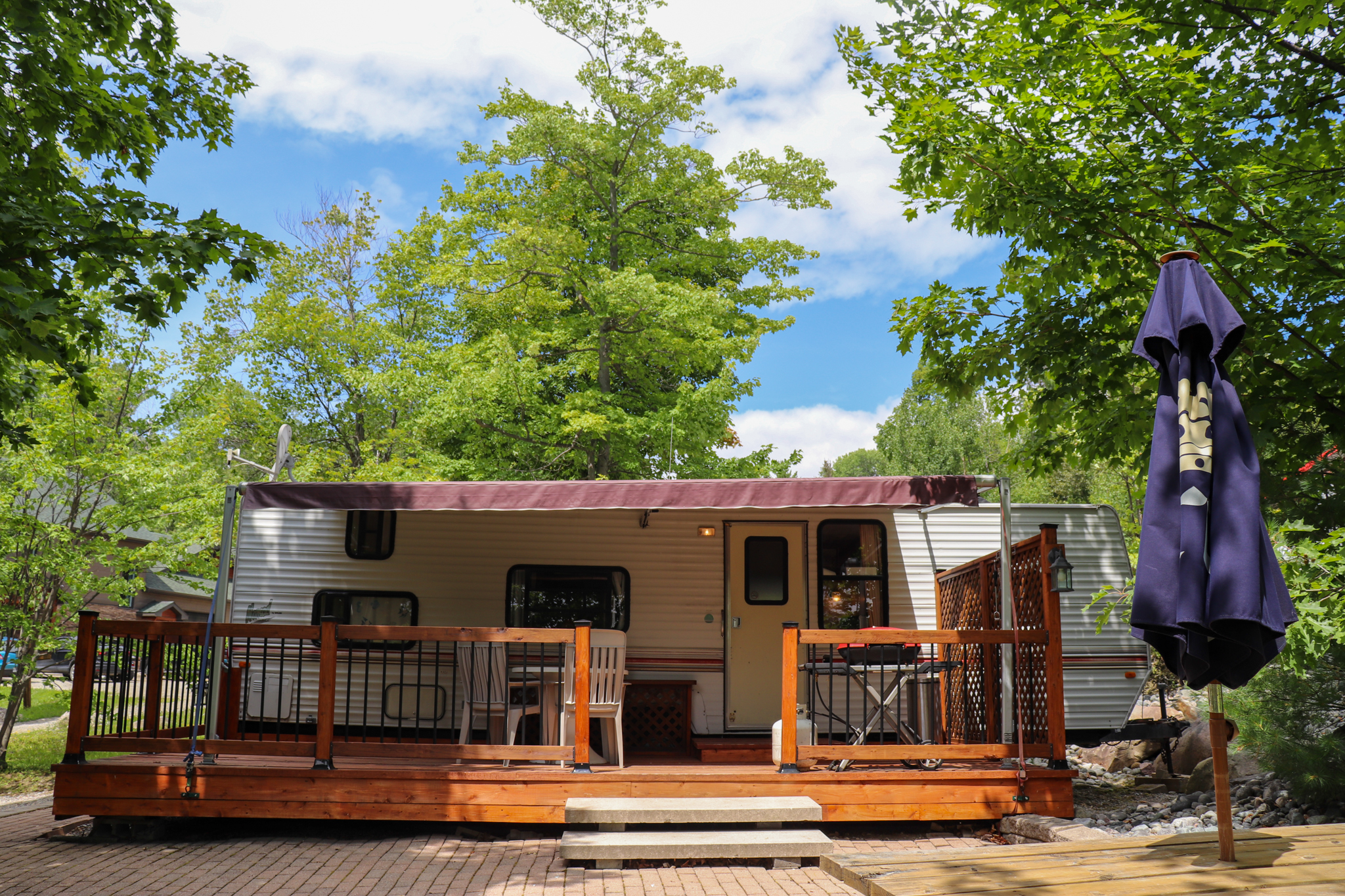This air-conditioned trailer can accomodate a maximum of 2 people. It consist of a bedroom with queen bed. The kitchen is equipped with a refrigerator, double electric cooking plate, microwave oven, coffee maker, toaster and a complete dishes ans cutlery set. In the lounge there is a TV, DVD player and a couch. The trailer includes a full bathroom. Outside, you will find a barbecue and a fire pit. This trailer of 27’ is located on the campground number 97 in the cottages section.