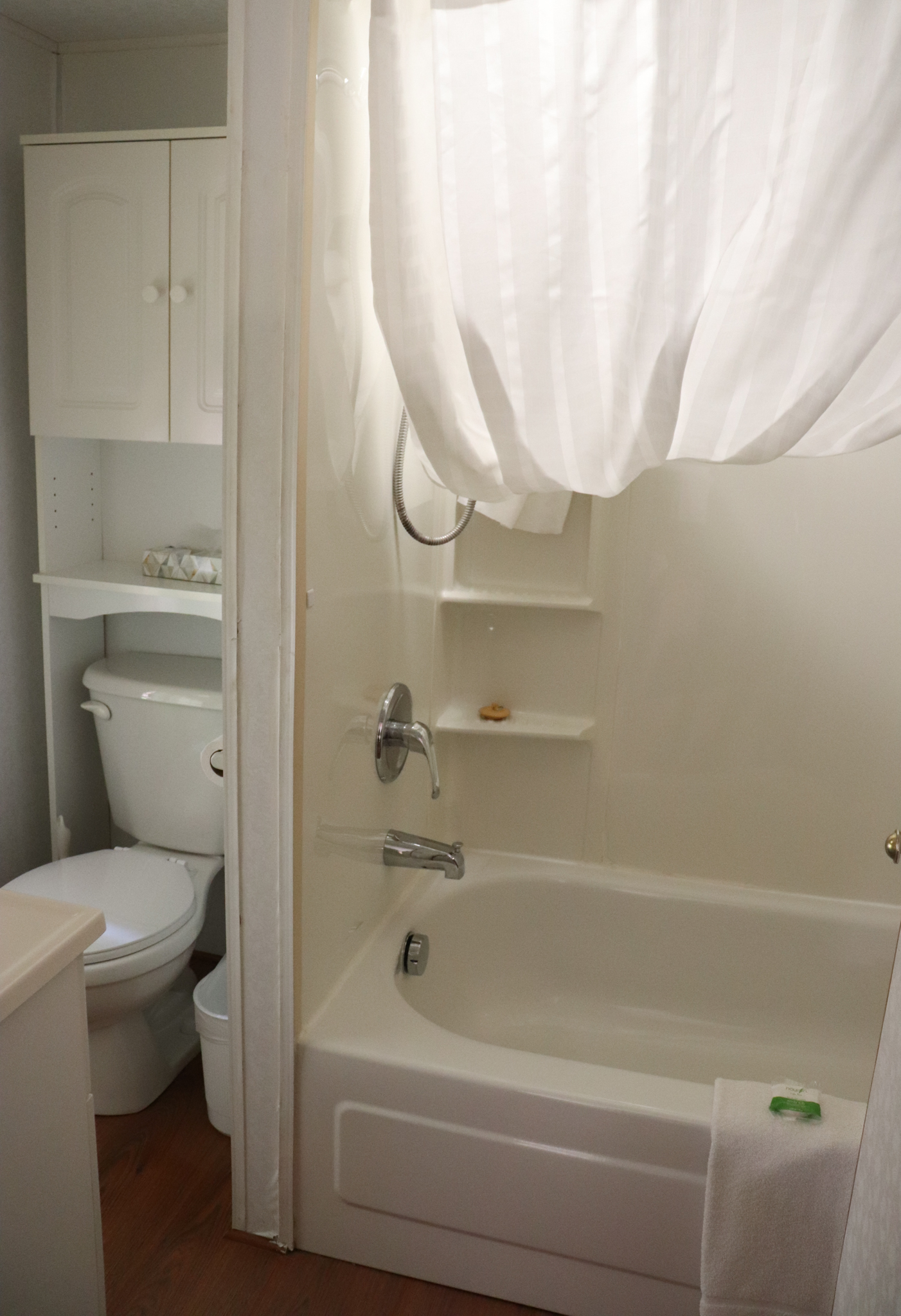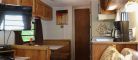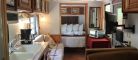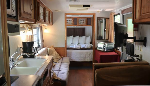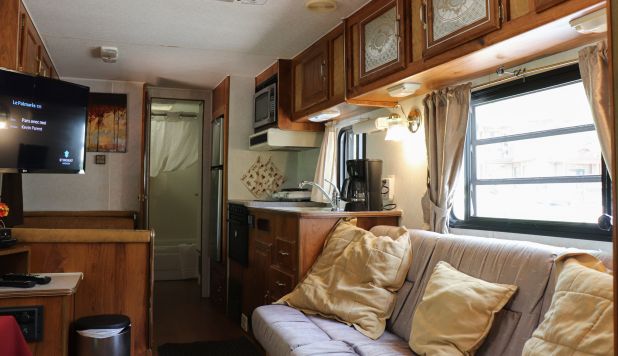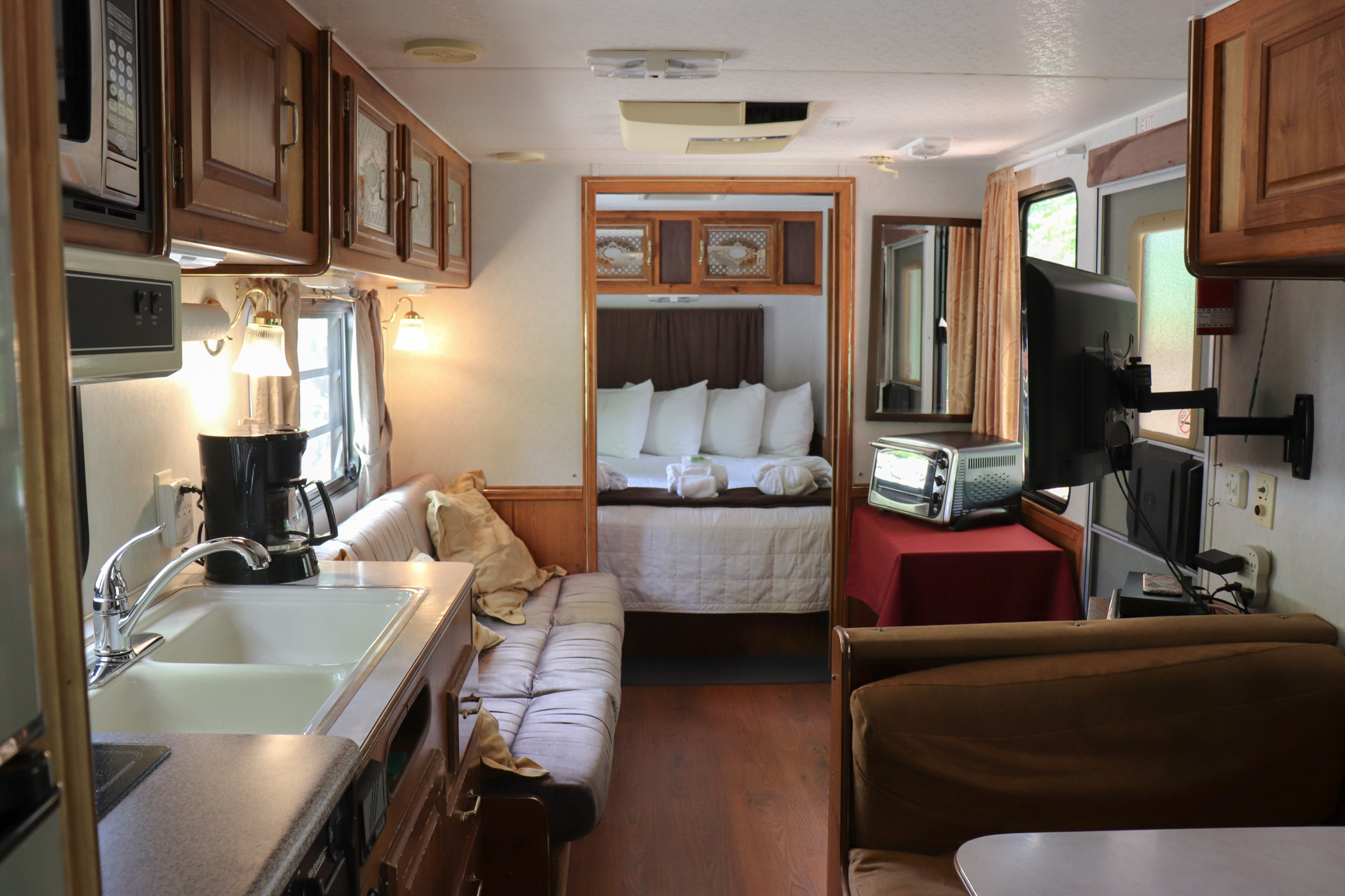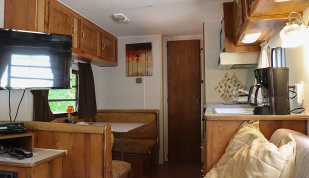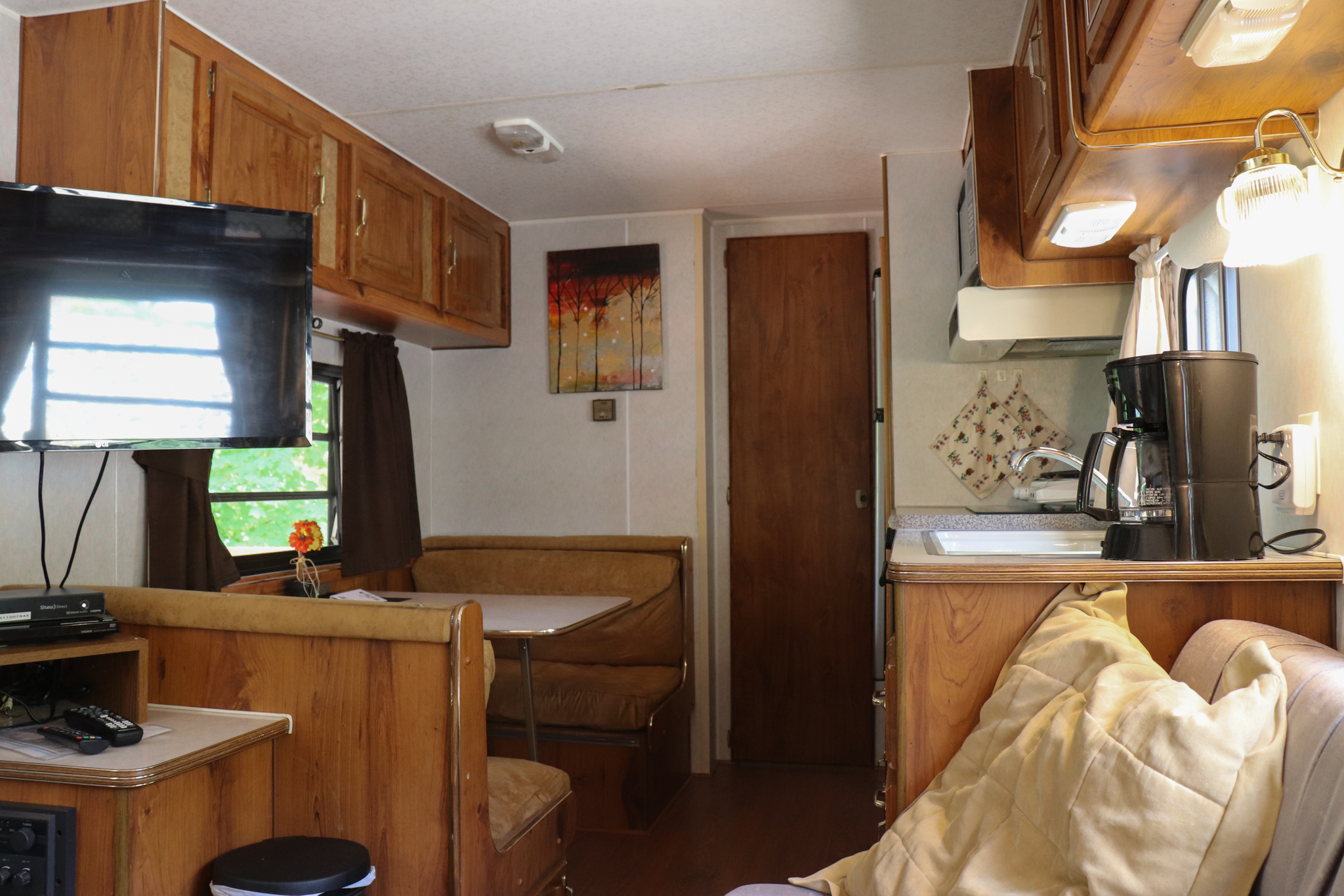 This air-conditioned trailer can accomodate a maximum of 2 people. It consist of a bedroom with queen bed. The kitchen is equipped with a refrigerator, double electric cooking plate, microwave oven, coffee maker, toaster and a complete dishes ans cutlery set. In the lounge there is a TV, DVD player and a couch. The trailer includes a full bathroom. Outside, you will find a barbecue and a fire pit. This trailer of 27’ is located on the campground number 97 in the cottages section.