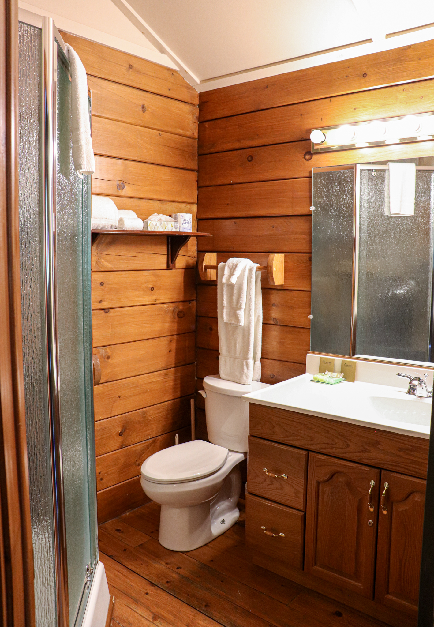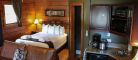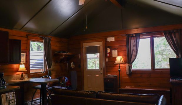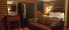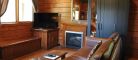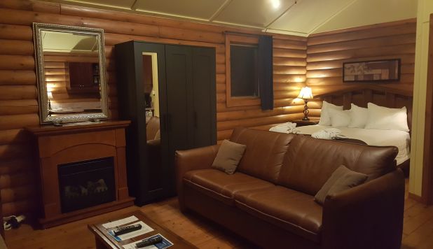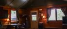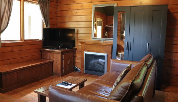 This cottage can accommodate up to two adults and two children. It is an open-space cottage; bachelor style. In the main room, there is a Queen-sized bed and a living room with an electric fireplace, a Queen-sized pull-out couch, an air conditioning unit, and a flatscreen TV with satellite receiver and DVD player. The kitchen area has a lunch counter, a small refrigerator, a microwave, a two-burner electric cooking plate, a coffee maker, a toaster oven, a regular toaster, and dishes and cutlery for four. The separate bathroom has a shower. Outside, there is a barbecue, a picnic table, and a fire pit. You can access wi-fi from the cottage.