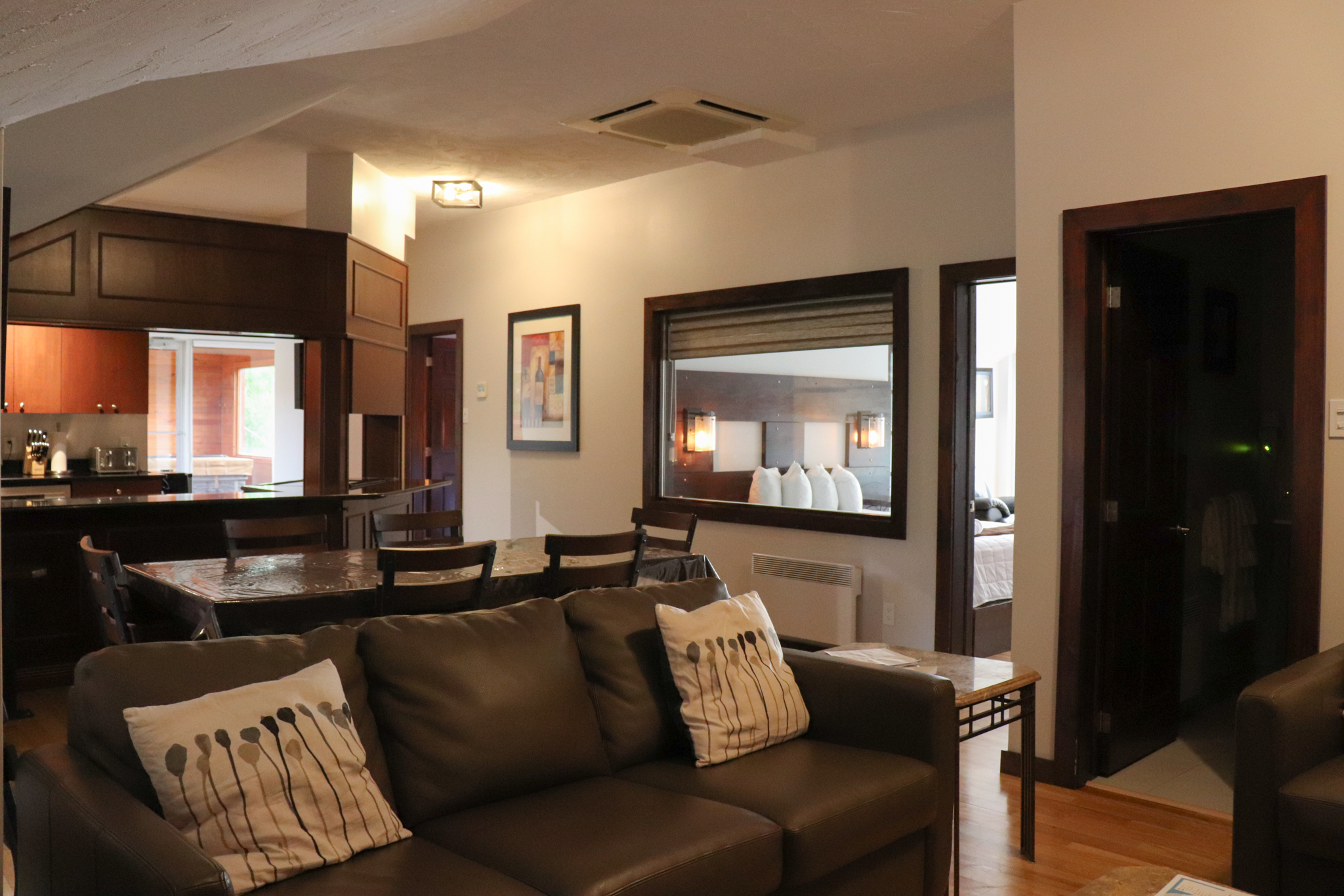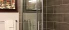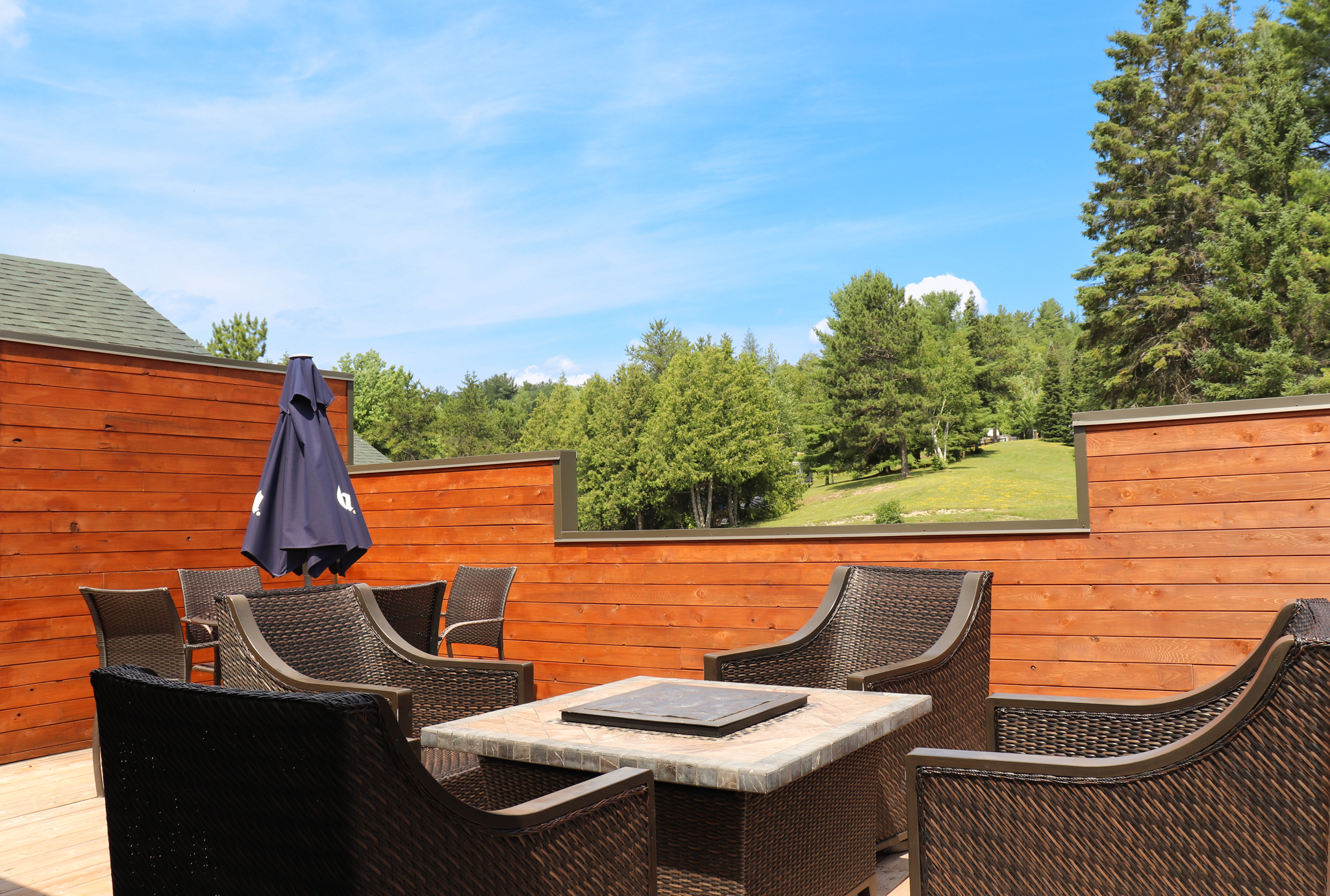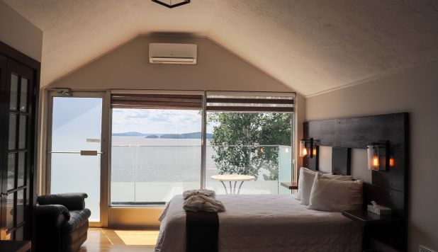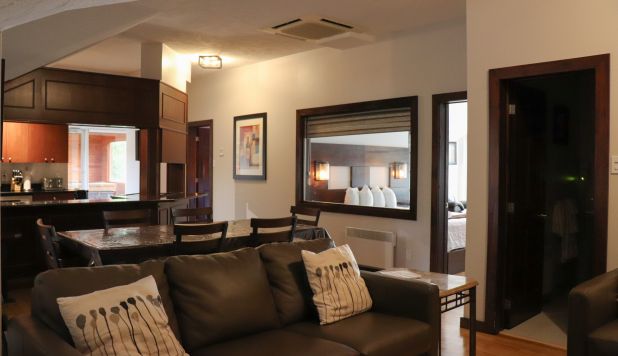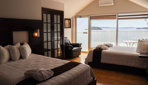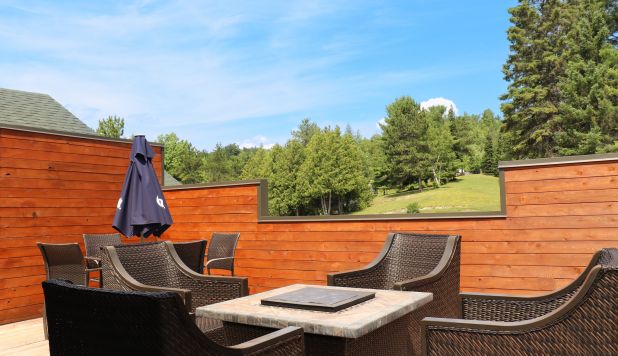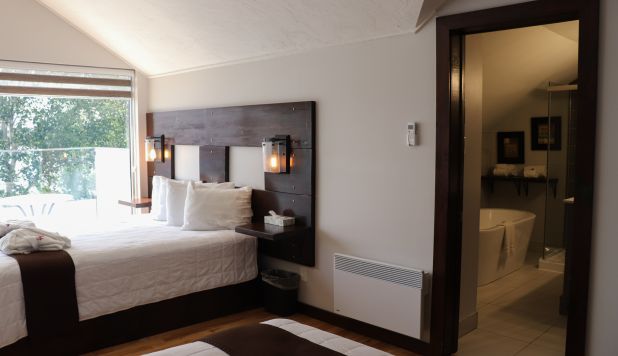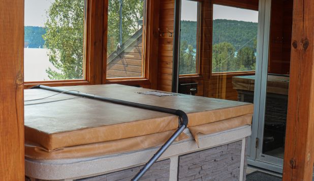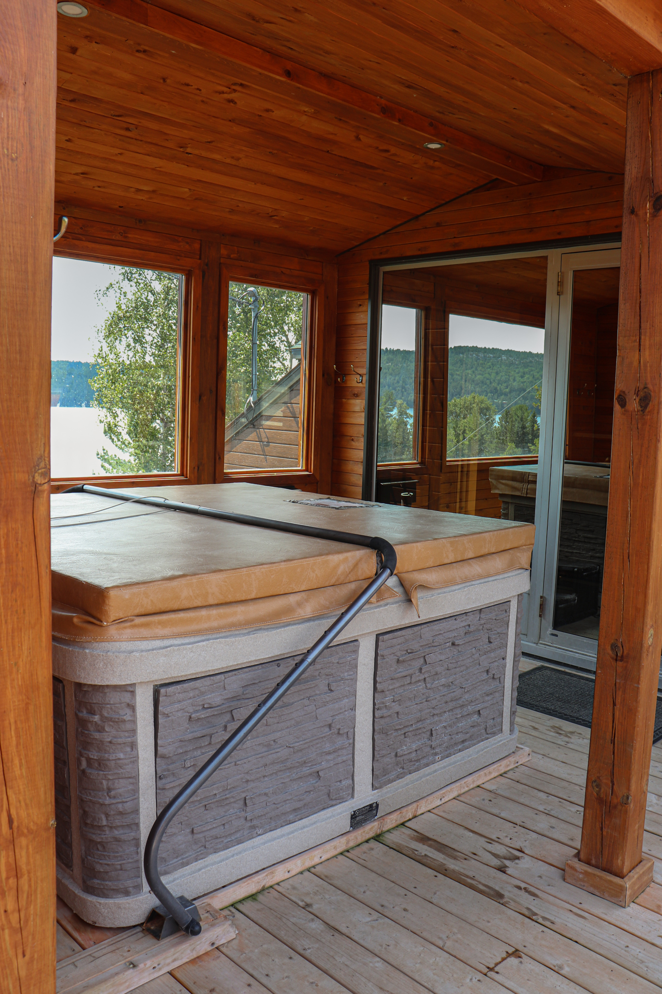 This cottage can accommodate a maximum of 8 people. There are two bedrooms, each with a Queen-sized bed and one with two Queen-sized bed. The kitchen has dishes and cutlery, a refrigerator, an oven, a dishwasher, a microwave, a coffee maker, and a toaster. In the living room, there is a propane fireplace, an air conditioning unit, and a flatscreen TV with satellite receiver and DVD player. There is one full bathroom and one bathroom (shower only). Outside, there is a barbecue, a fire (propane), and a private hot tub under a roof.