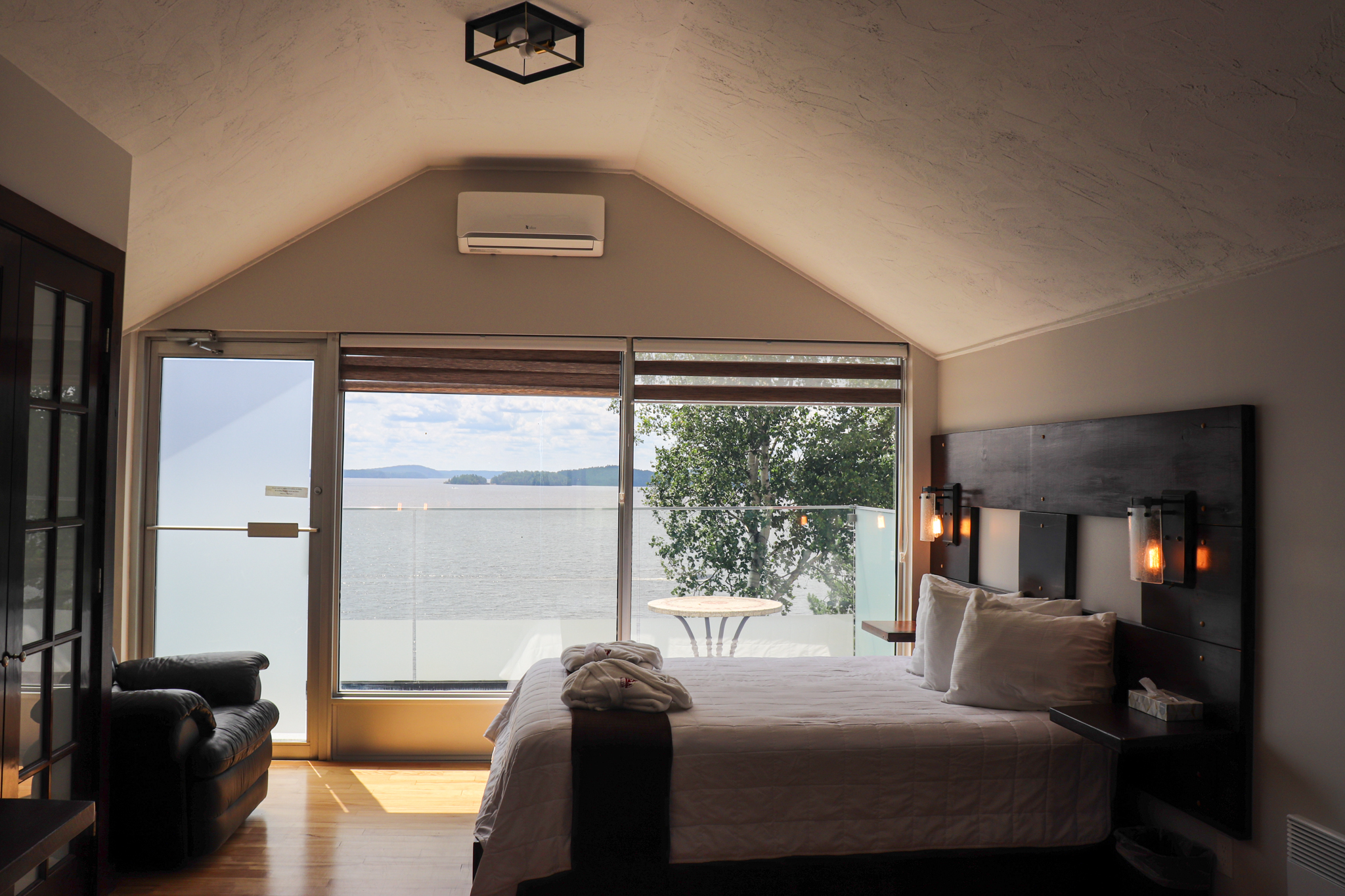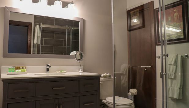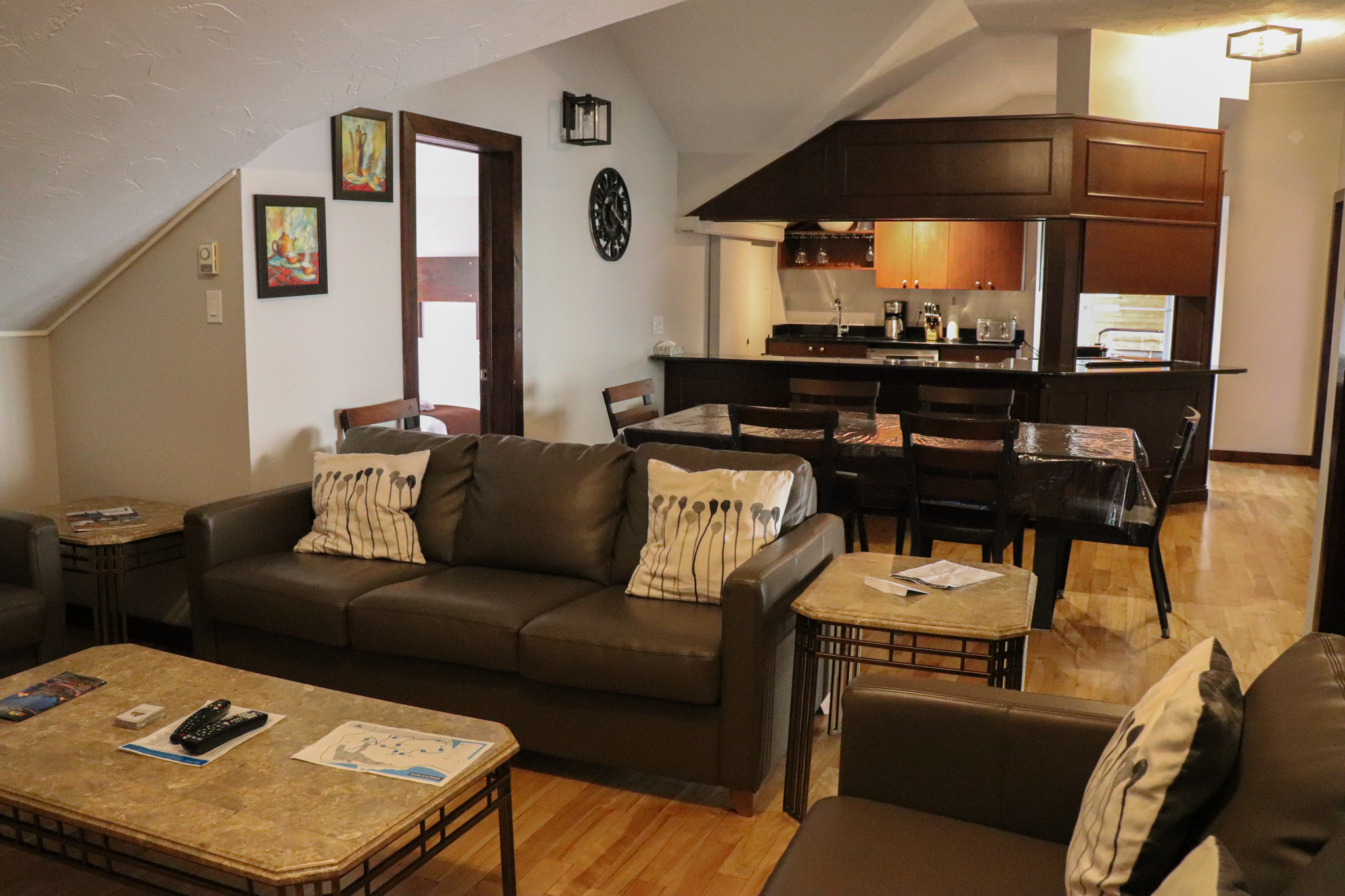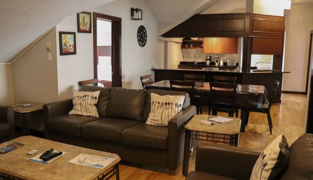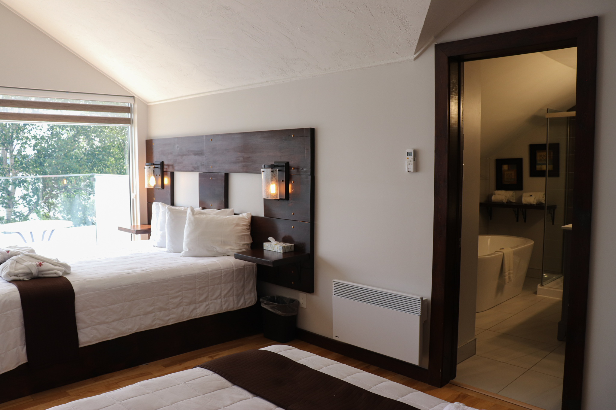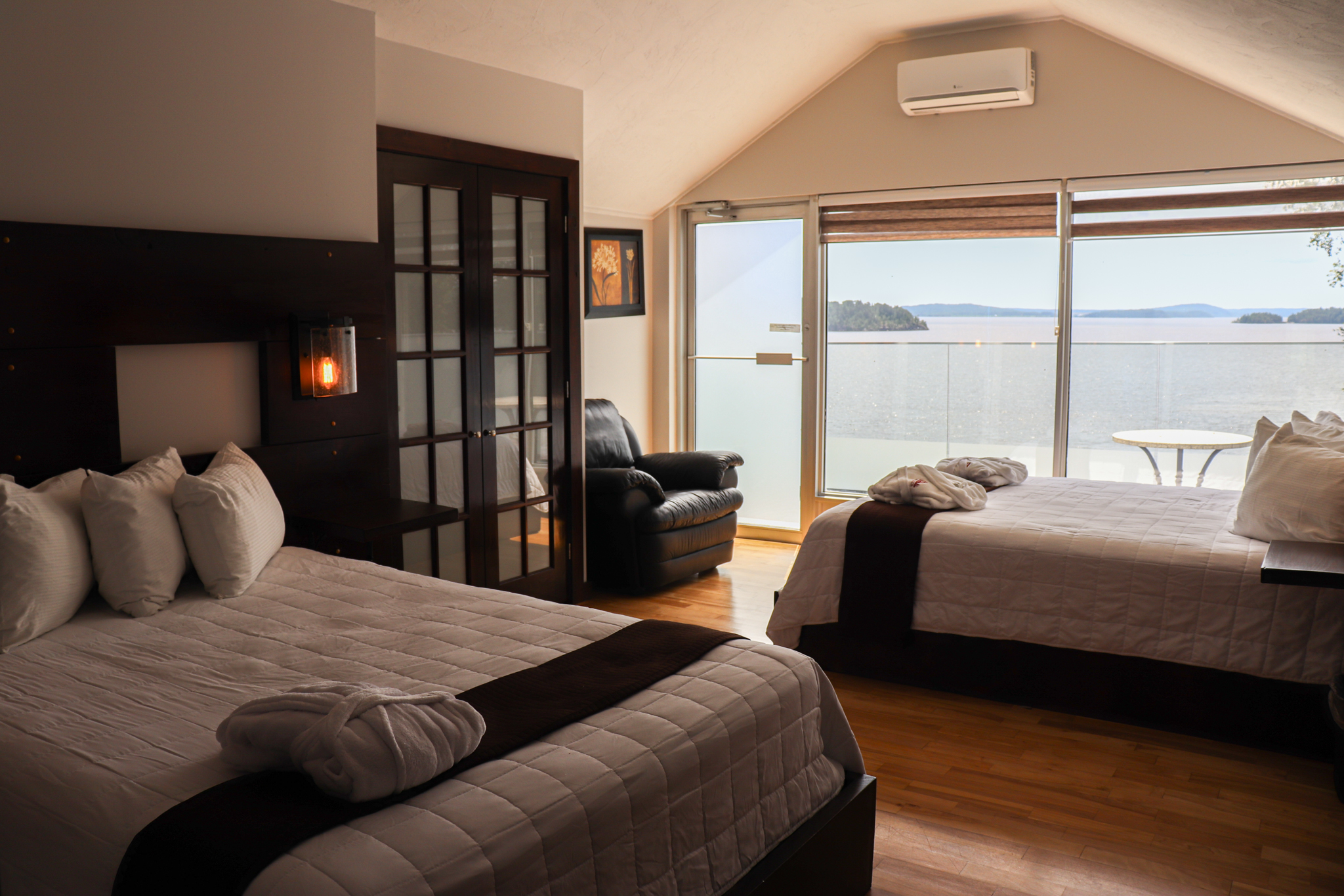 This cottage can accommodate a maximum of 8 people. There are two bedrooms, each with a Queen-sized bed and one with two Queen-sized bed. The kitchen has dishes and cutlery, a refrigerator, an oven, a dishwasher, a microwave, a coffee maker, and a toaster. In the living room, there is a propane fireplace, an air conditioning unit, and a flatscreen TV with satellite receiver and DVD player. There is one full bathroom and one bathroom (shower only). Outside, there is a barbecue, a fire (propane), and a private hot tub under a roof.