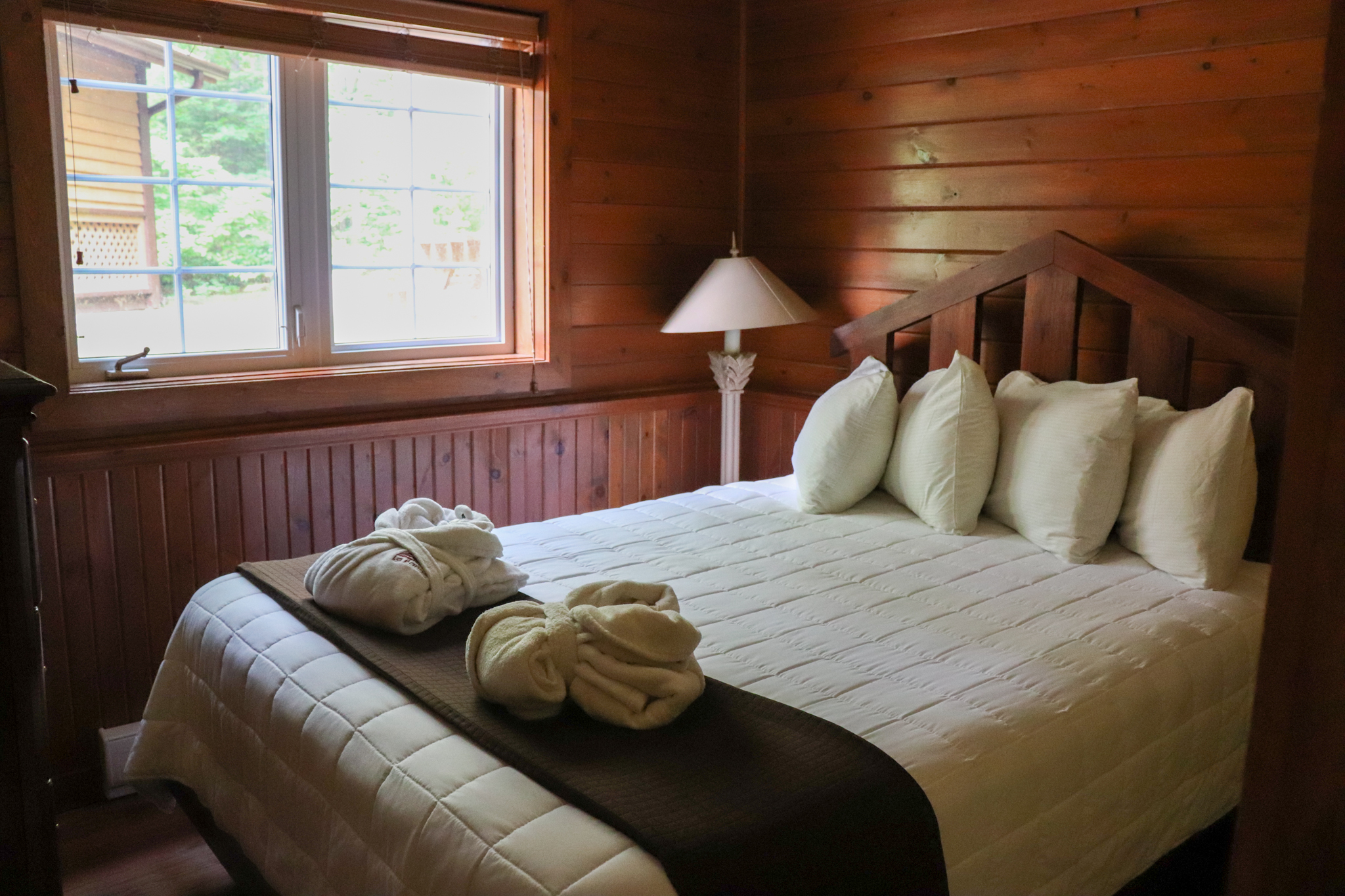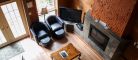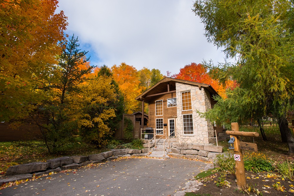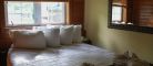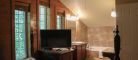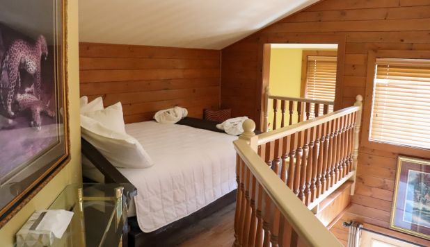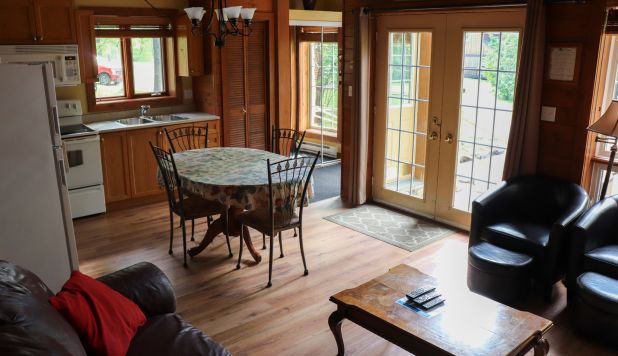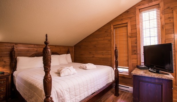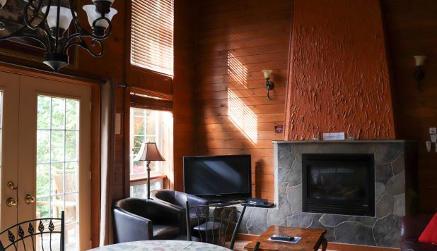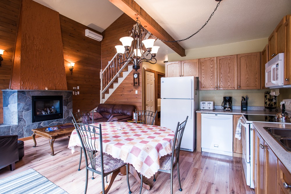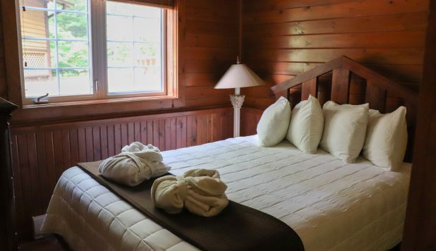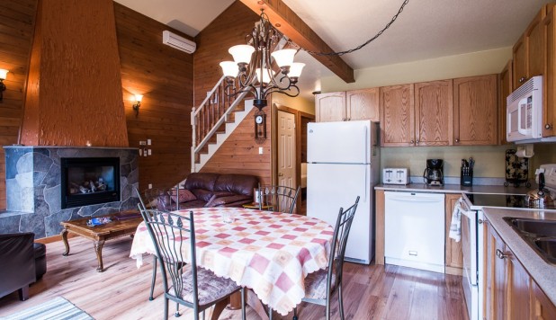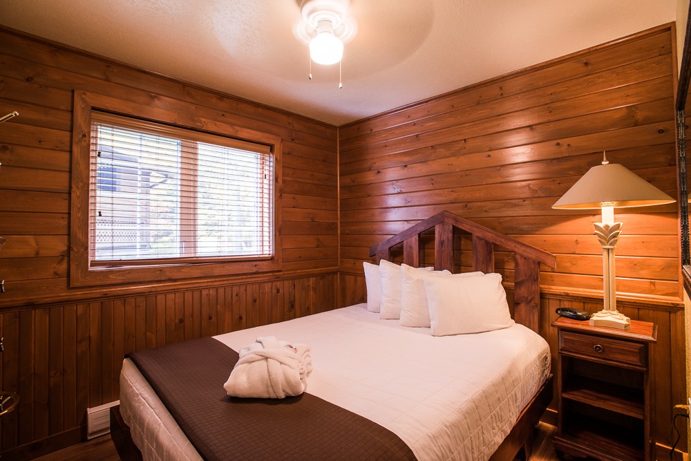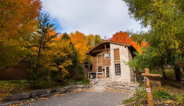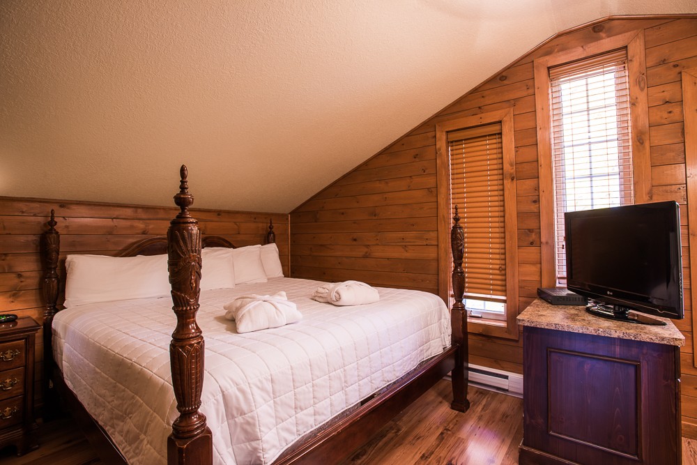 This two-story cottage can accommodate a maximum of 8 people. On the first floor, there are two bedrooms, each with a Queen-sized bed. On the second floor, there is a laundry room, a small mezzanine with Queen-sized bed and the master bedroom with a King-sized bed, a bathtub, a flatscreen TV with satellite receiver and DVD player, a vanity, and a private toilet. The kitchen has dishes and cutlery, a refrigerator, an oven, a dishwasher, a microwave, a coffee-maker, and a toaster. In the living room, there is a propane fireplace, an air conditioning unit, and a flatscreen TV with satellite receiver and DVD player. There is a full bathroom on the ground floor. Outside, there is a barbecue, a fire pit, and a private hot tub.