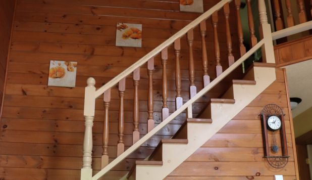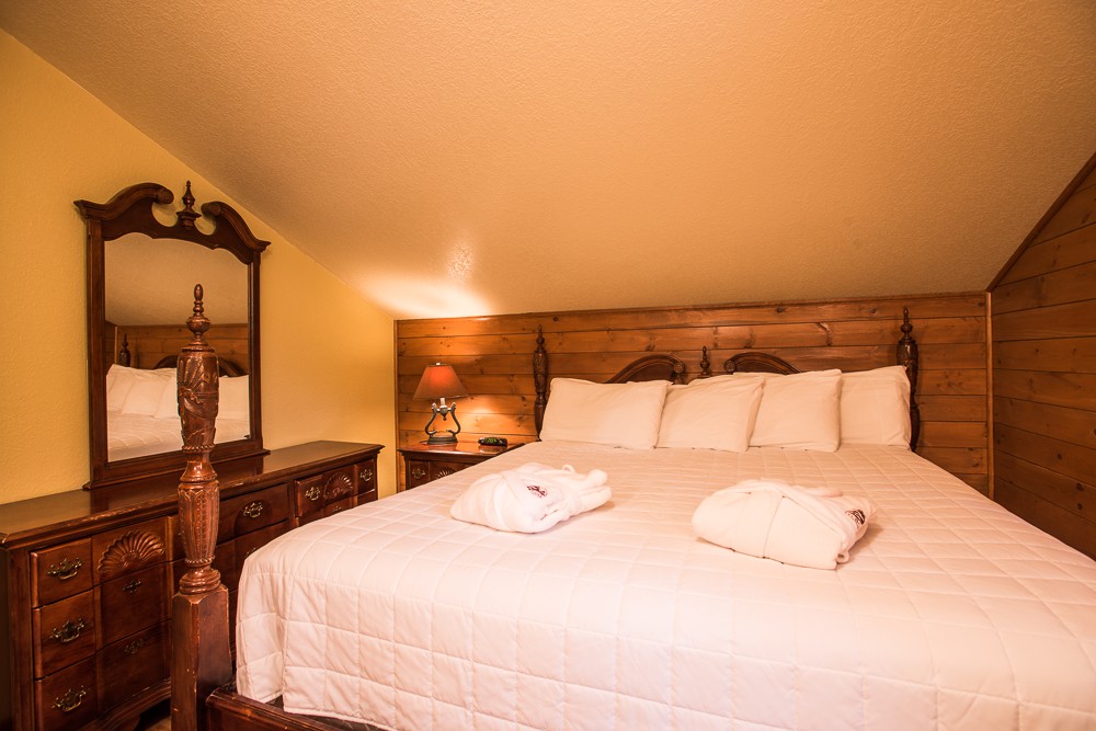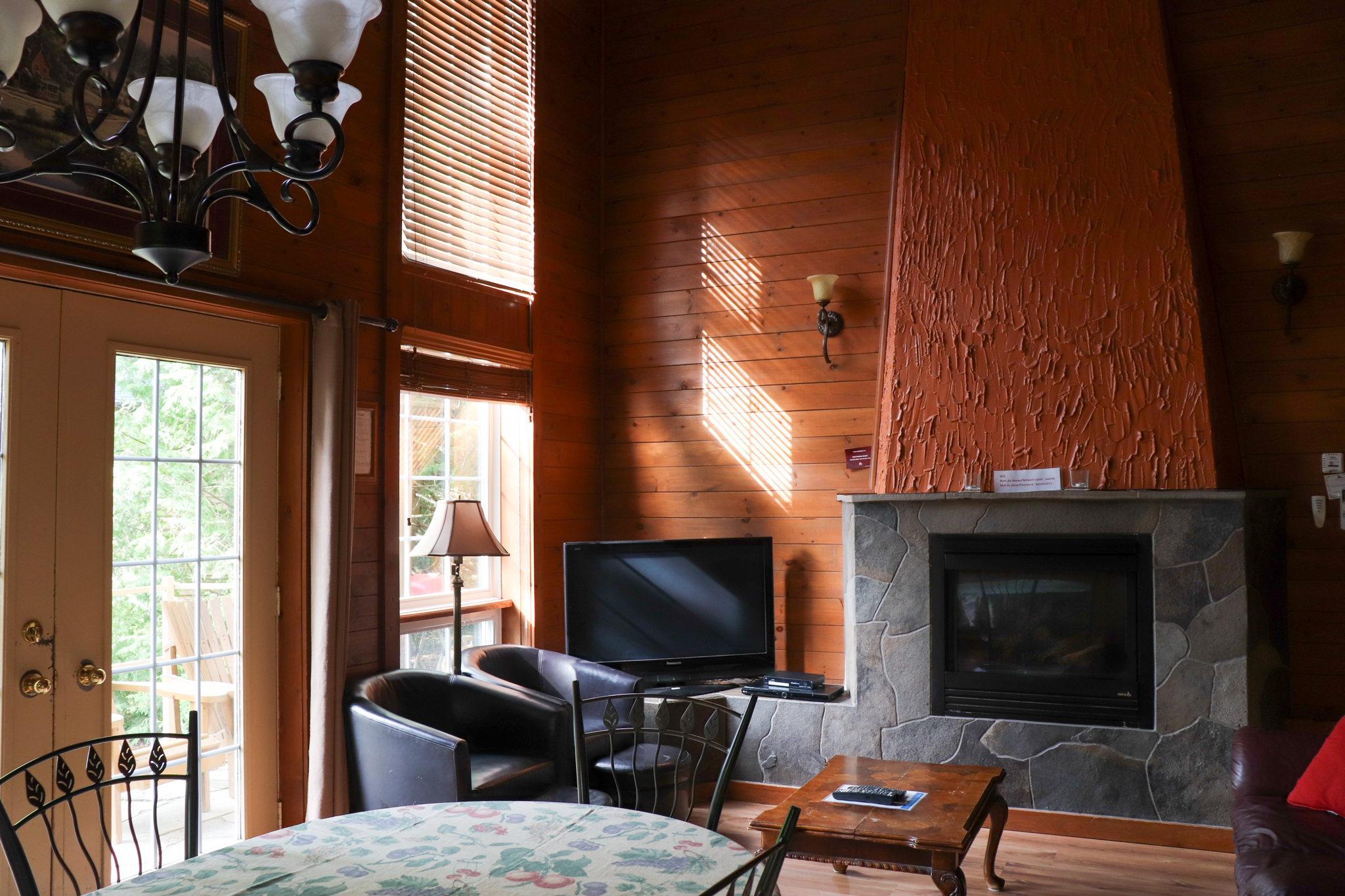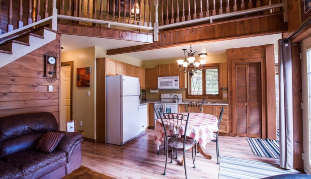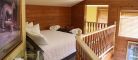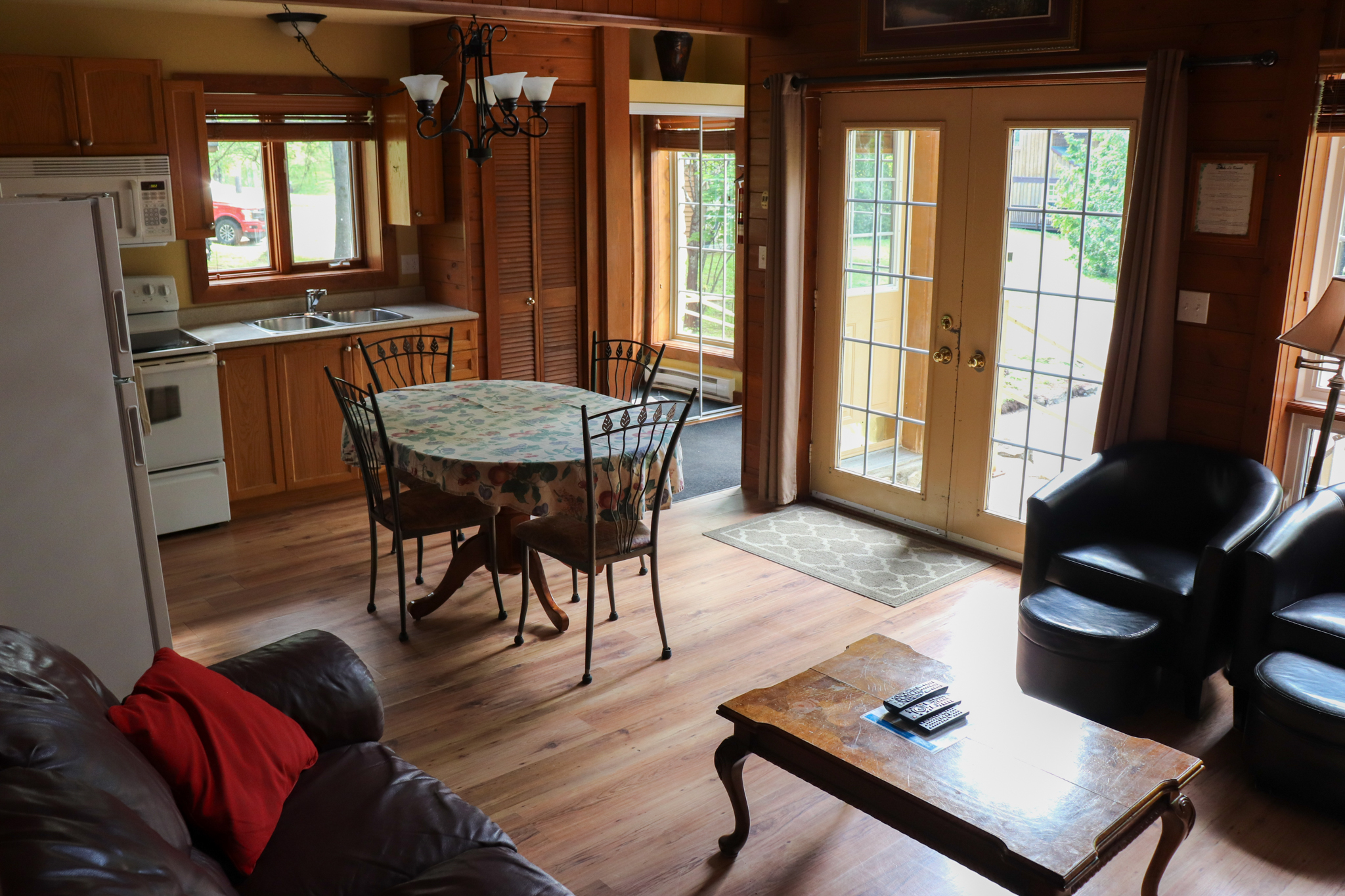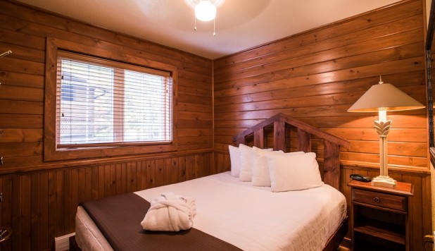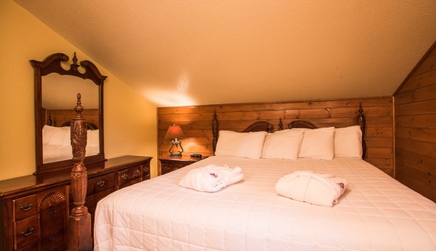 This two-story cottage can accommodate a maximum of 8 people. On the first floor, there are two bedrooms, each with a Queen-sized bed. On the second floor, there is a laundry room, a small mezzanine with Queen-sized bed and the master bedroom with a King-sized bed, a bathtub, a flatscreen TV with satellite receiver and DVD player, a vanity, and a private toilet. The kitchen has dishes and cutlery, a refrigerator, an oven, a dishwasher, a microwave, a coffee-maker, and a toaster. In the living room, there is a propane fireplace, an air conditioning unit, and a flatscreen TV with satellite receiver and DVD player. There is a full bathroom on the ground floor. Outside, there is a barbecue, a fire pit, and a private hot tub.