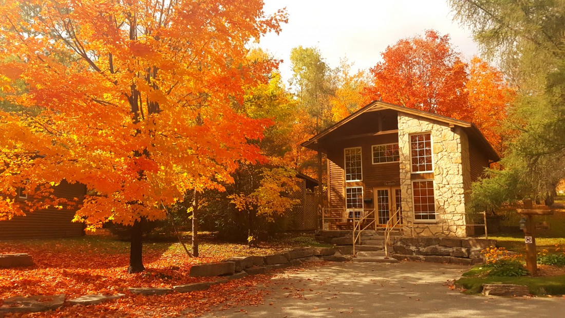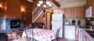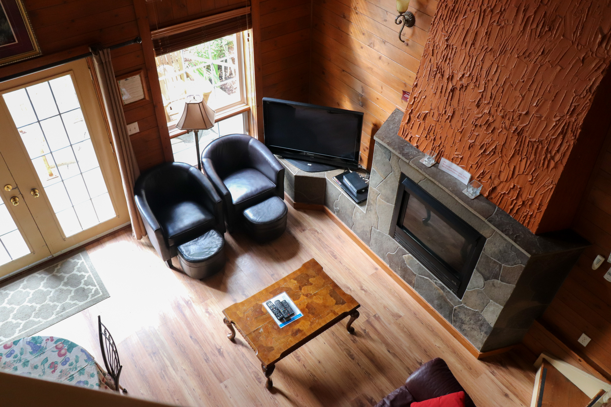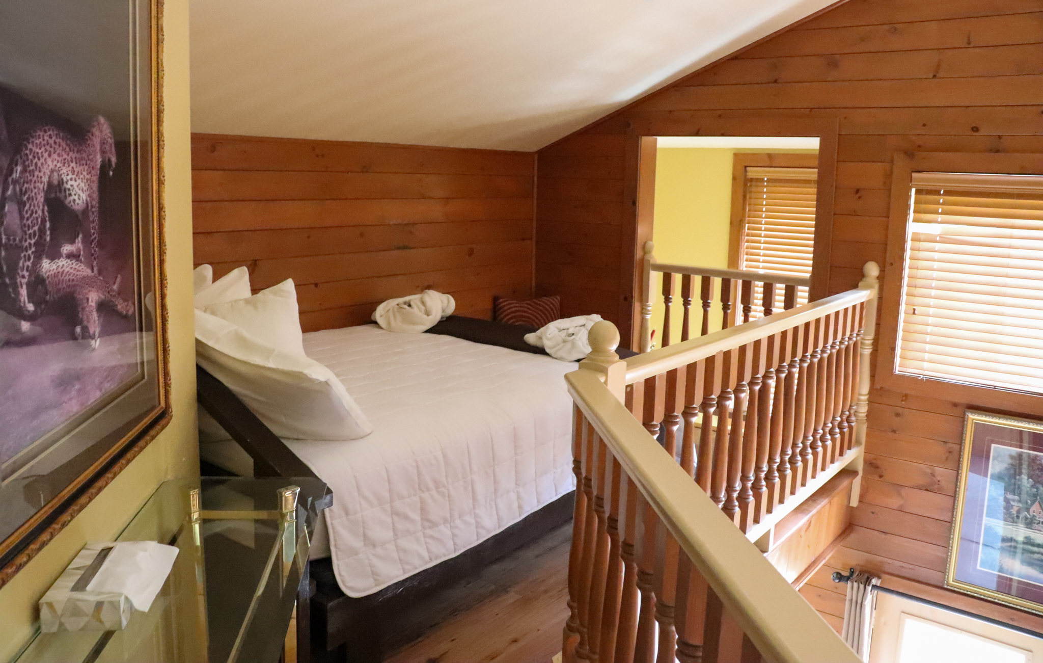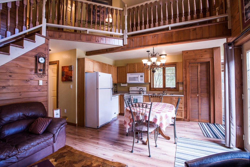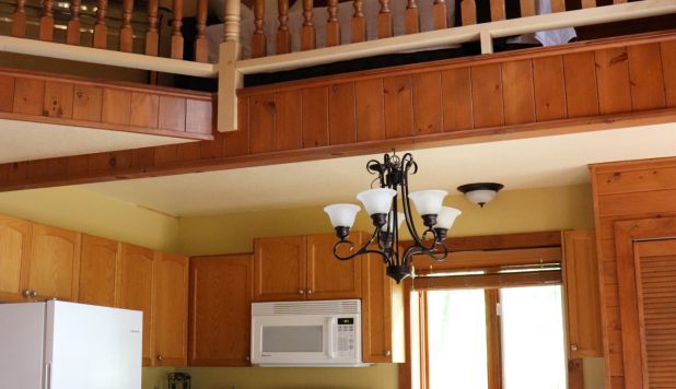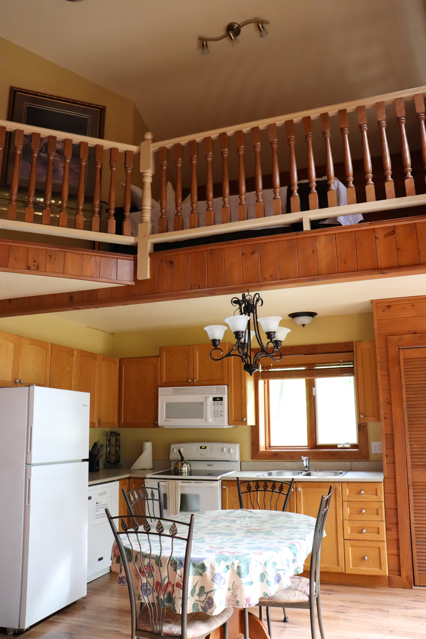 This two-story cottage can accommodate a maximum of 8 people. On the first floor, there are two bedrooms, each with a Queen-sized bed. On the second floor, there is a laundry room, a small mezzanine with Queen-sized bed and the master bedroom with a King-sized bed, a bathtub, a flatscreen TV with satellite receiver and DVD player, a vanity, and a private toilet. The kitchen has dishes and cutlery, a refrigerator, an oven, a dishwasher, a microwave, a coffee-maker, and a toaster. In the living room, there is a propane fireplace, an air conditioning unit, and a flatscreen TV with satellite receiver and DVD player. There is a full bathroom on the ground floor. Outside, there is a barbecue, a fire pit, and a private hot tub.