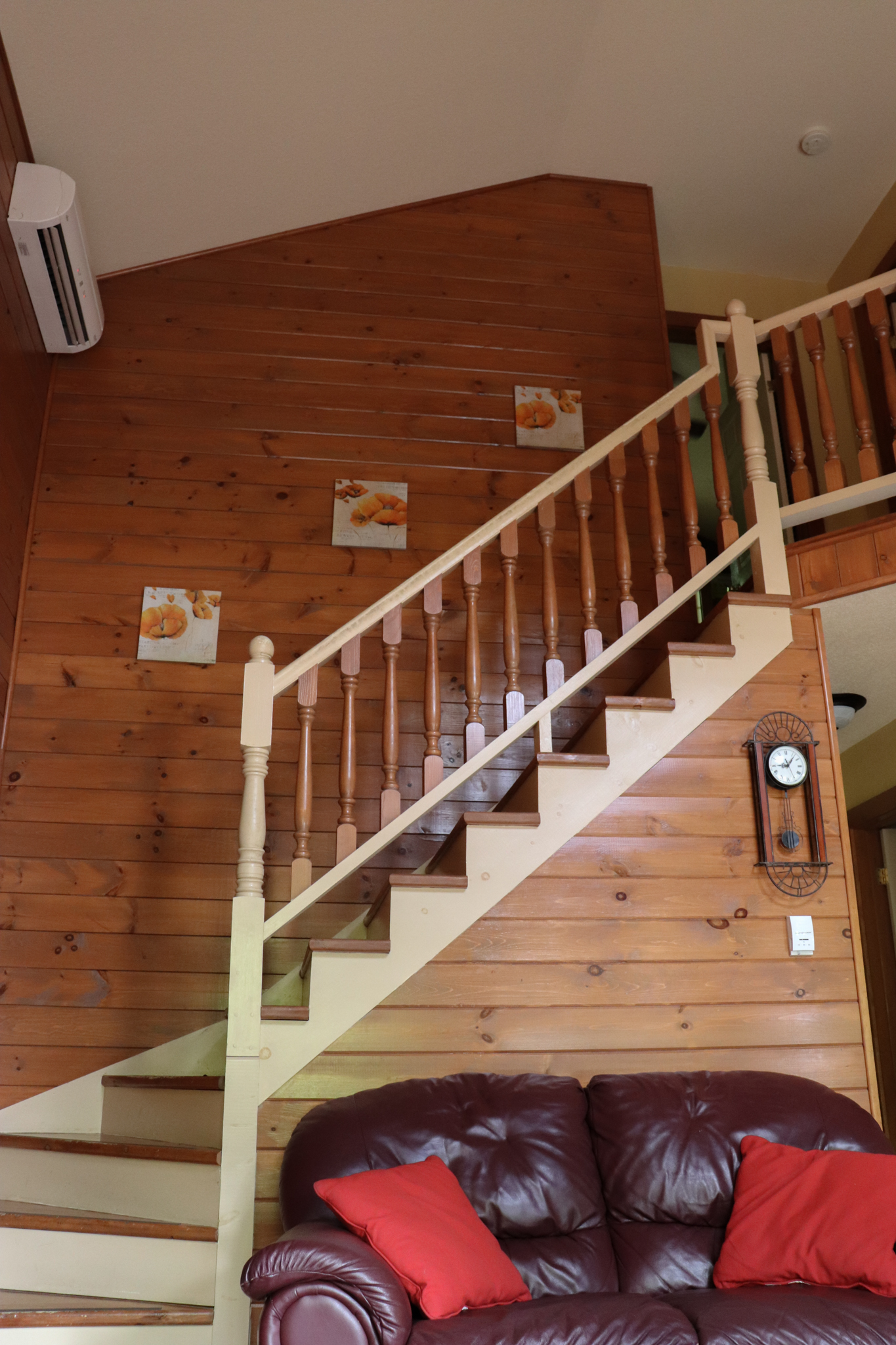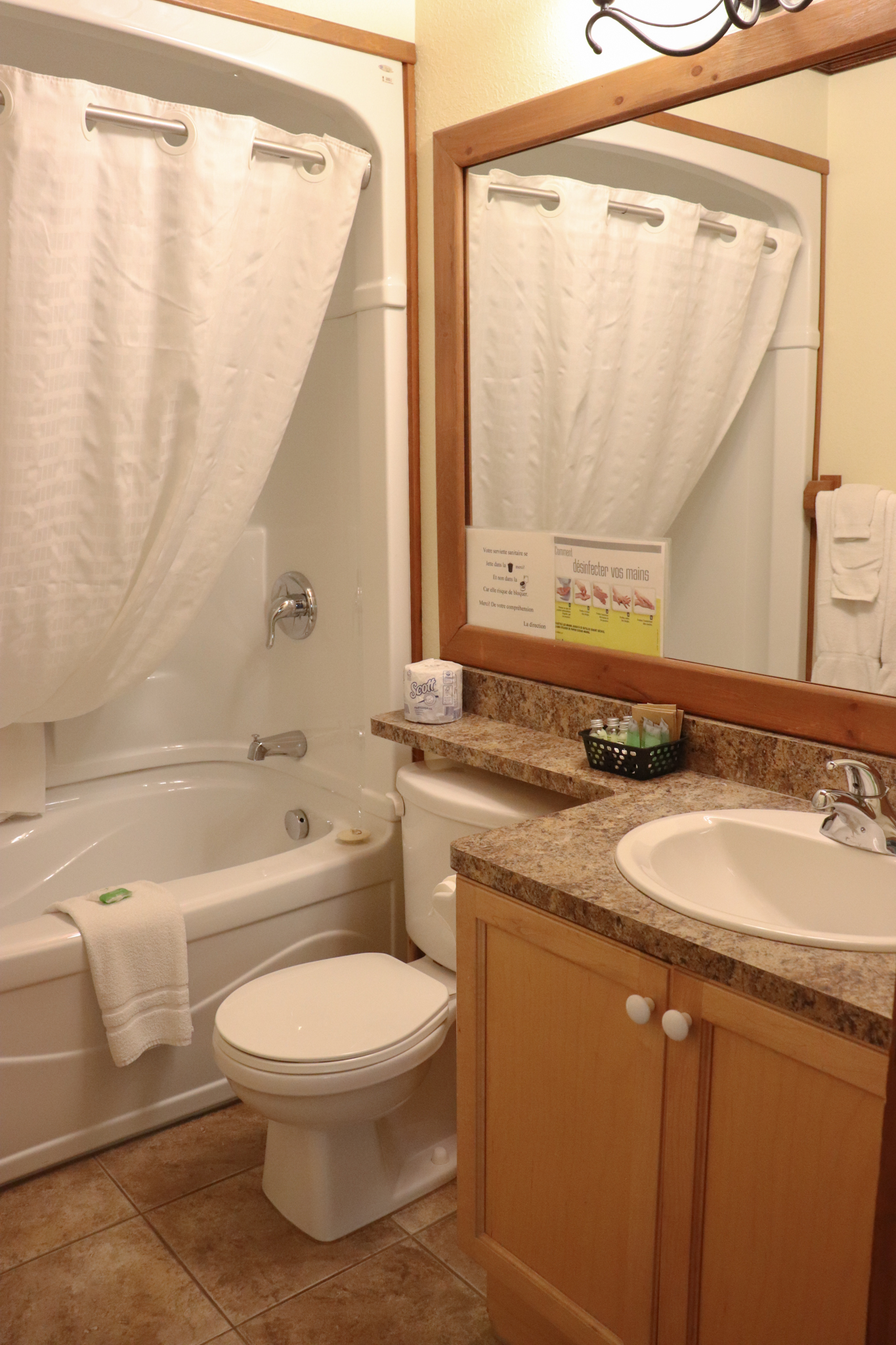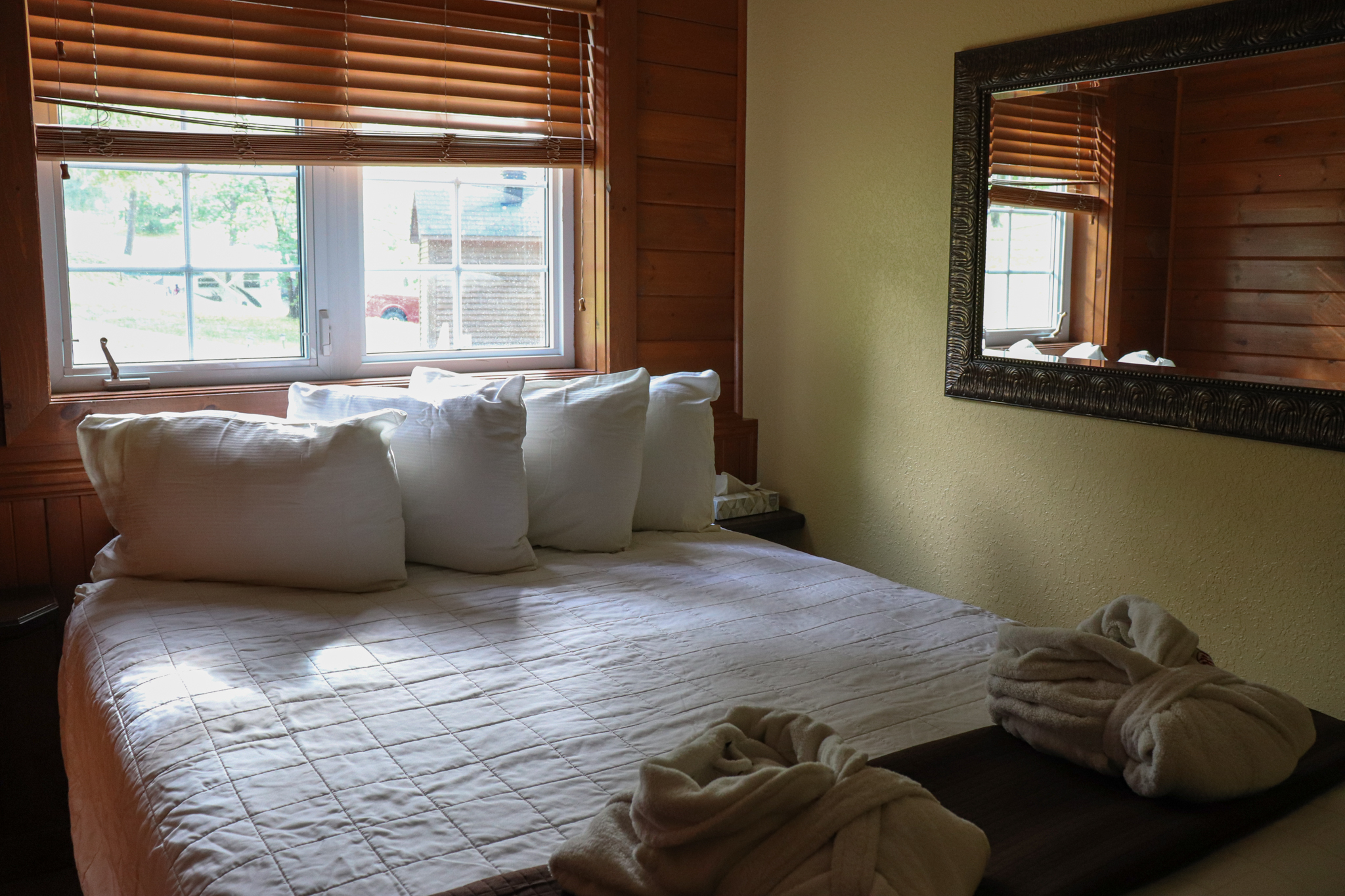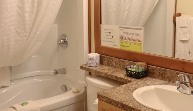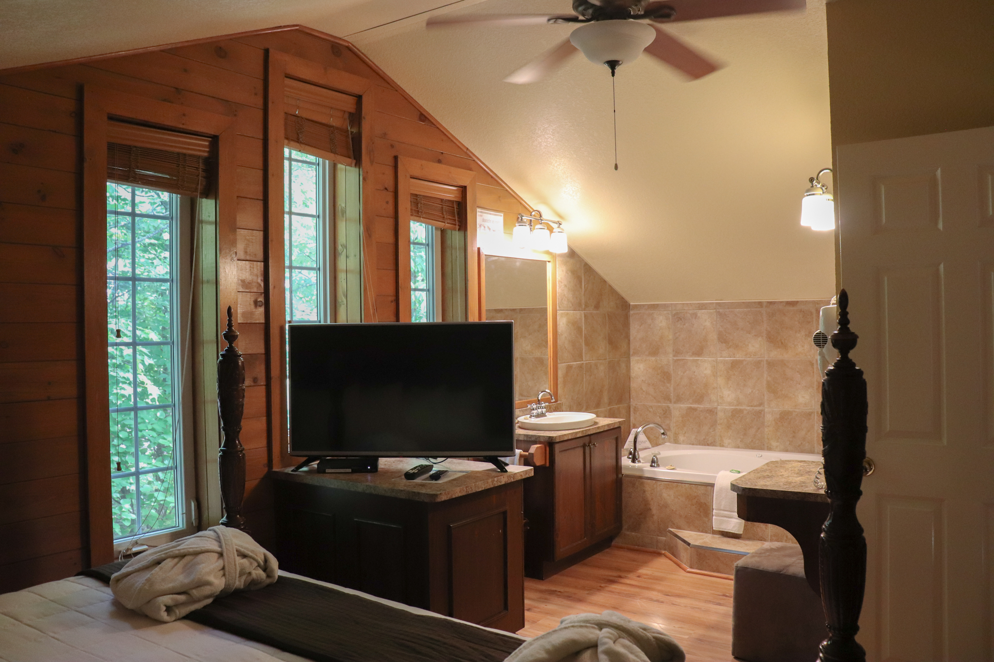 This two-story cottage can accommodate a maximum of 8 people. On the first floor, there are two bedrooms, each with a Queen-sized bed. On the second floor, there is a laundry room, a small mezzanine with Queen-sized bed and the master bedroom with a King-sized bed, a bathtub, a flatscreen TV with satellite receiver and DVD player, a vanity, and a private toilet. The kitchen has dishes and cutlery, a refrigerator, an oven, a dishwasher, a microwave, a coffee-maker, and a toaster. In the living room, there is a propane fireplace, an air conditioning unit, and a flatscreen TV with satellite receiver and DVD player. There is a full bathroom on the ground floor. Outside, there is a barbecue, a fire pit, and a private hot tub.